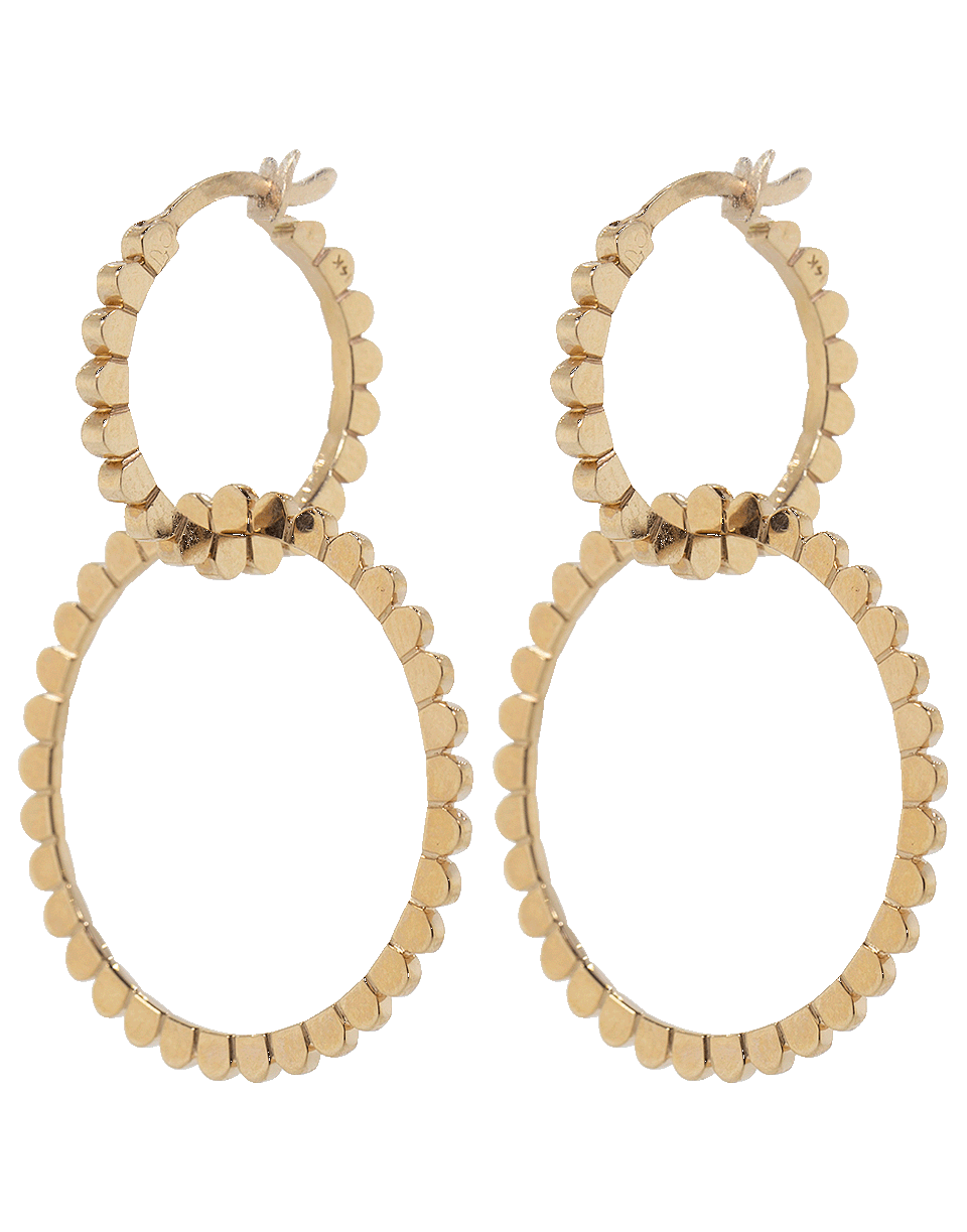 Two 18k rose gold linked daisy hoop earrings with huggie closures. For pierced ears.