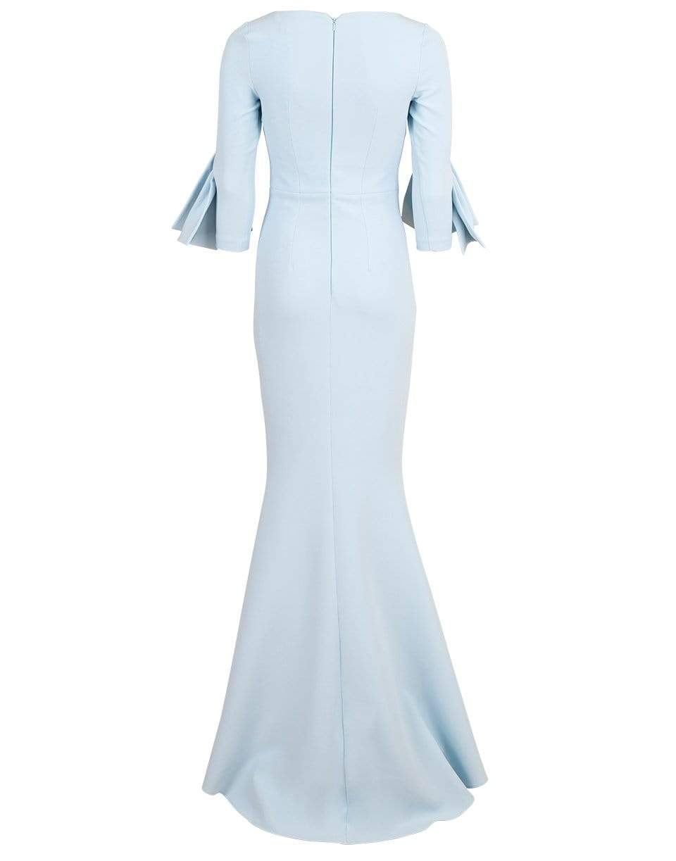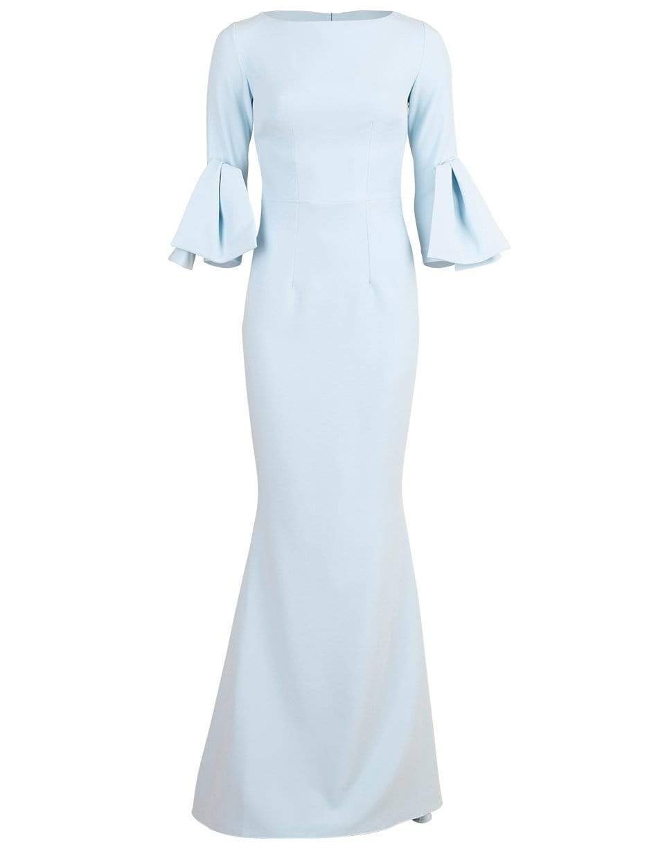 Safiyaa heavy crepe Tyra gown with a slim fit, elbow length bell sleeves, round neck, concealed zip closure, and a full length.