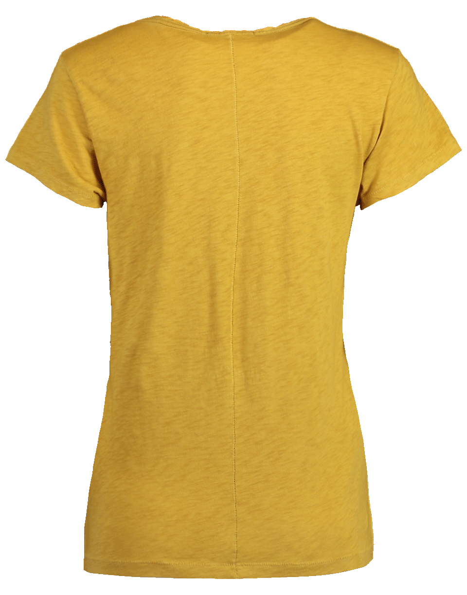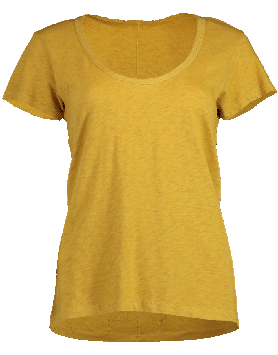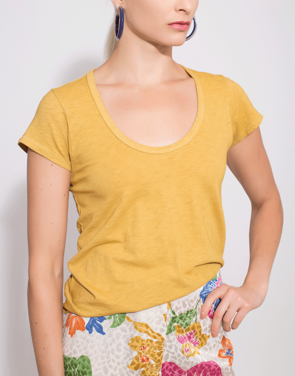 Mustard yellow U-neck tee by Rag & Bone. This soft basic is crafted from pure cotton and features a deep scoop neckline, short sleeves, and a relaxed t-shirt fit.