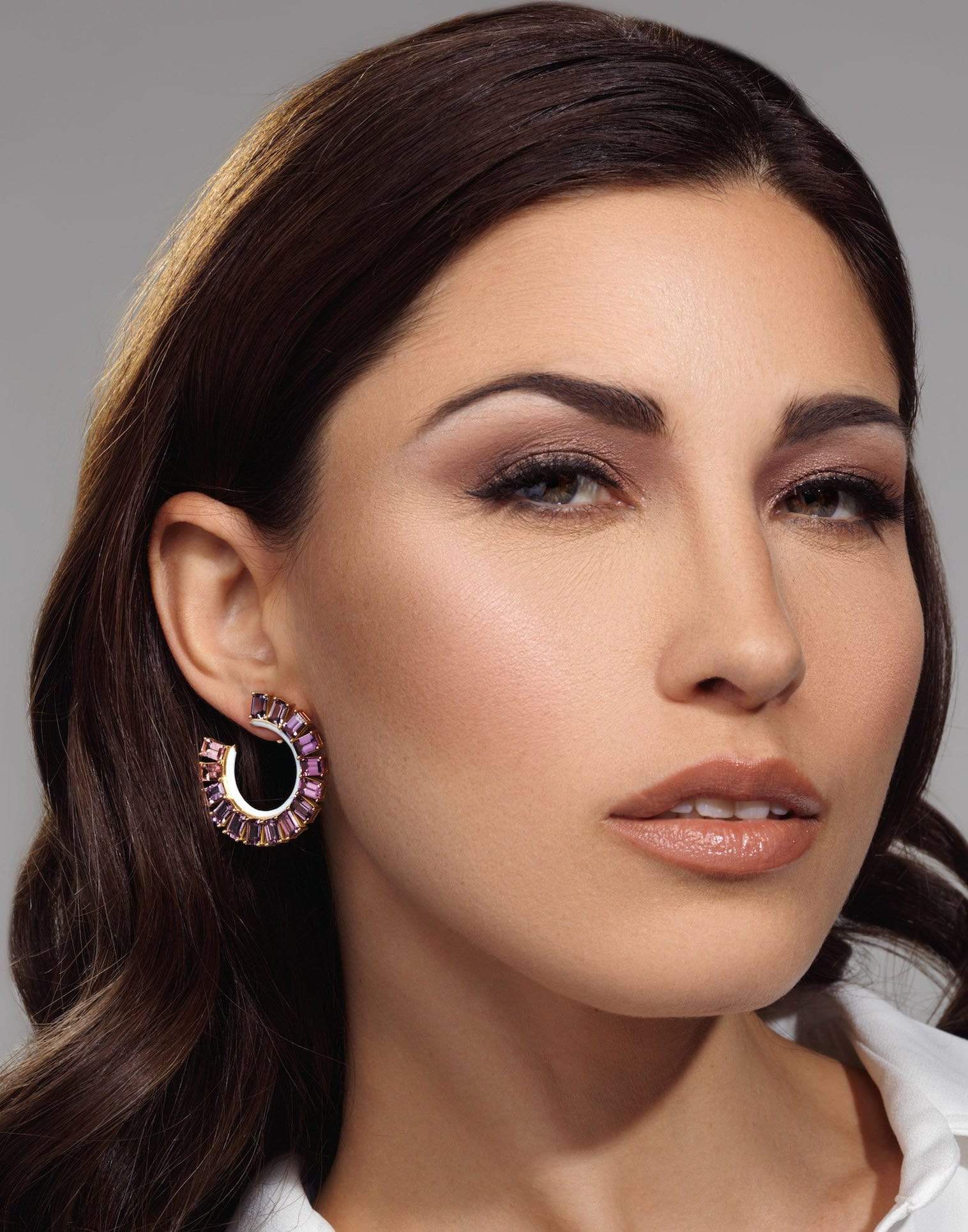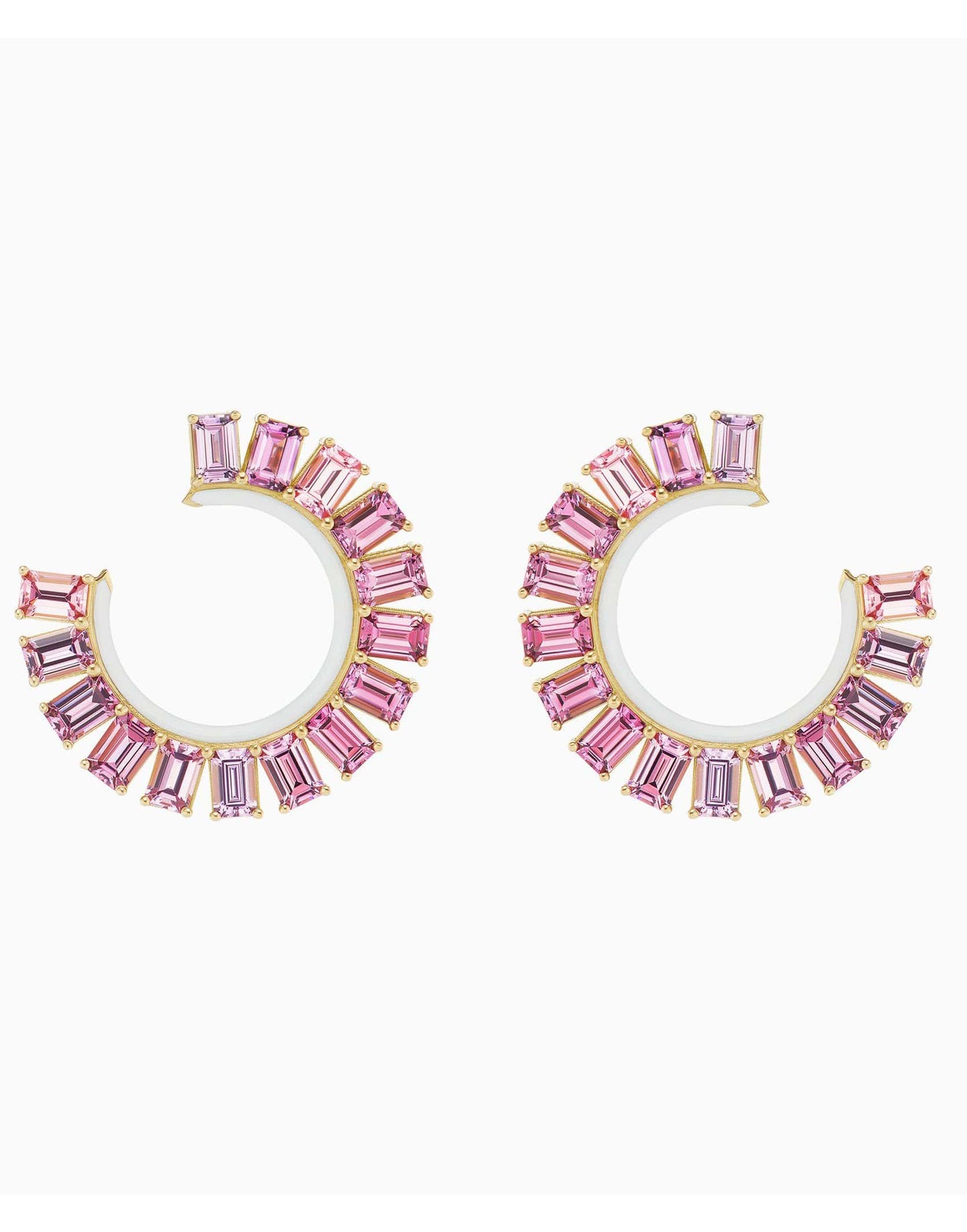Emily P Wheeler unicorn earrings. The one-of-a-kind Unicorn Earrings are made with big beautiful unicorn-colored spinel emerald cut rectangles totaling just under 18 carats, accented with puffy white enamel. The bypass hoop has a slight curvature in it to appear as though it tucks behind the ear.
