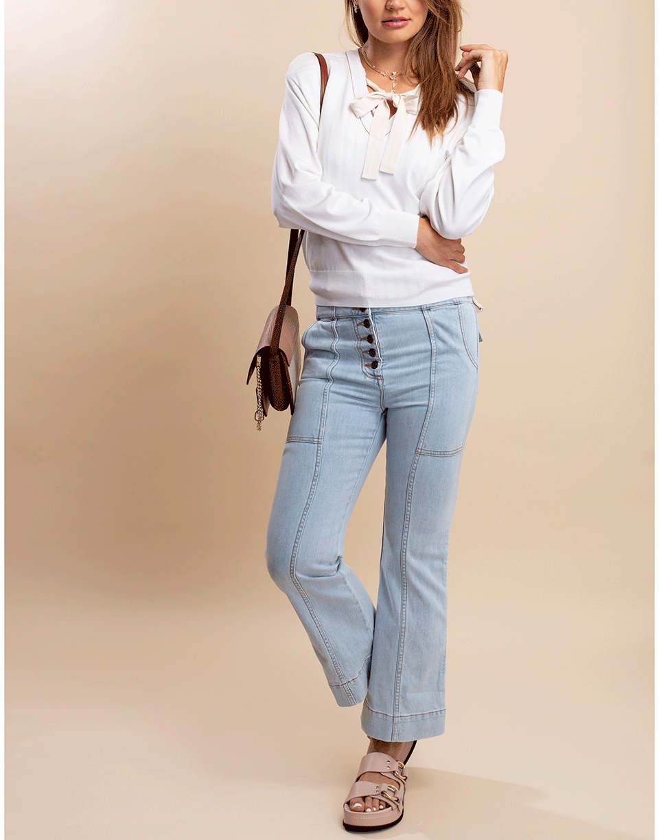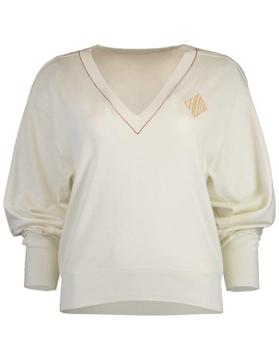Chloe cashmere sweater with a relaxed fit, V-neck, logo at chest, and contrasting trim along the neckline.