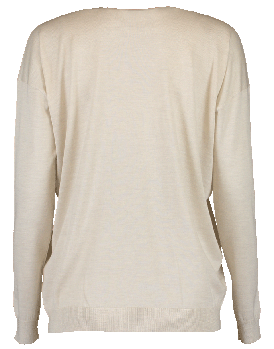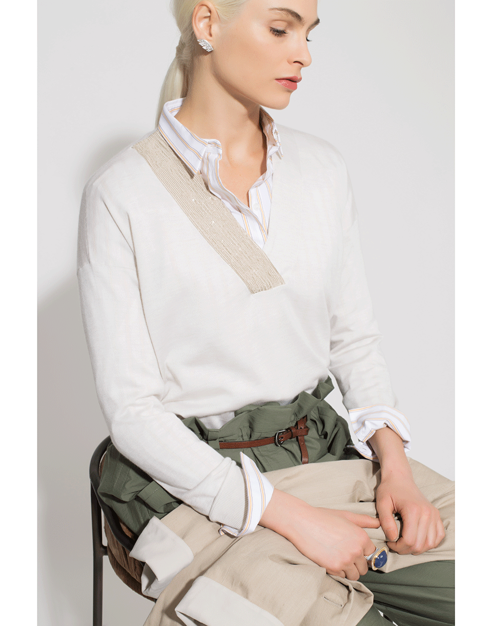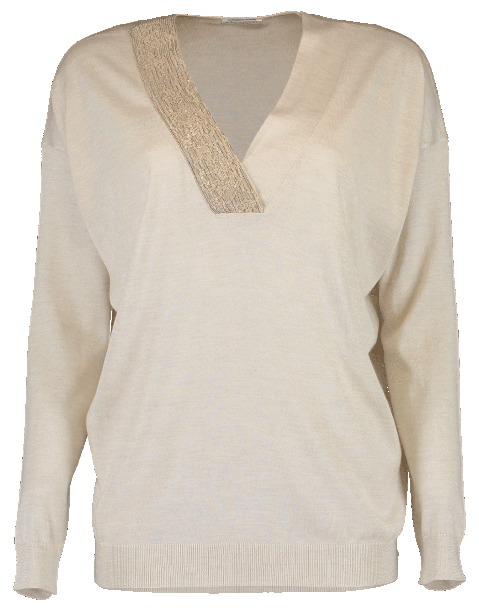 Cashmere and silk v-neck pullover by Brunello Cucinelli. This long-sleeved pullover features an embellished strip of shiny monili with a floral pattern along the edge of the v neckline, ribbed edges and comfortable slouchy fit.