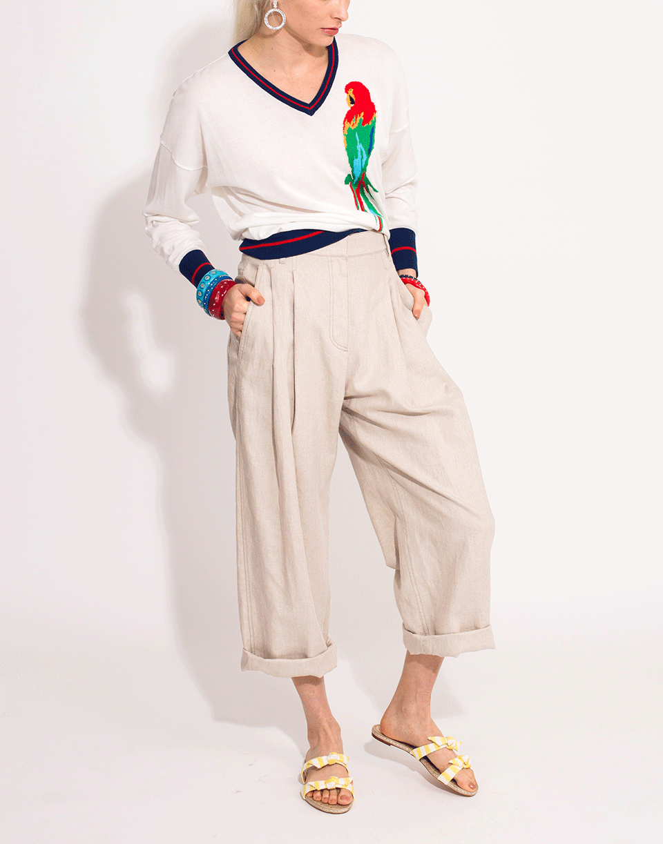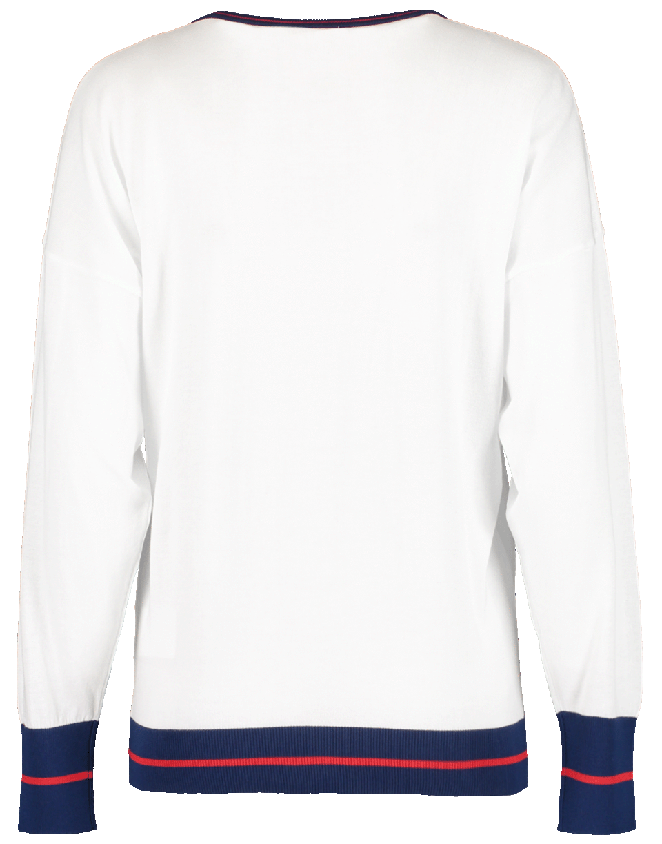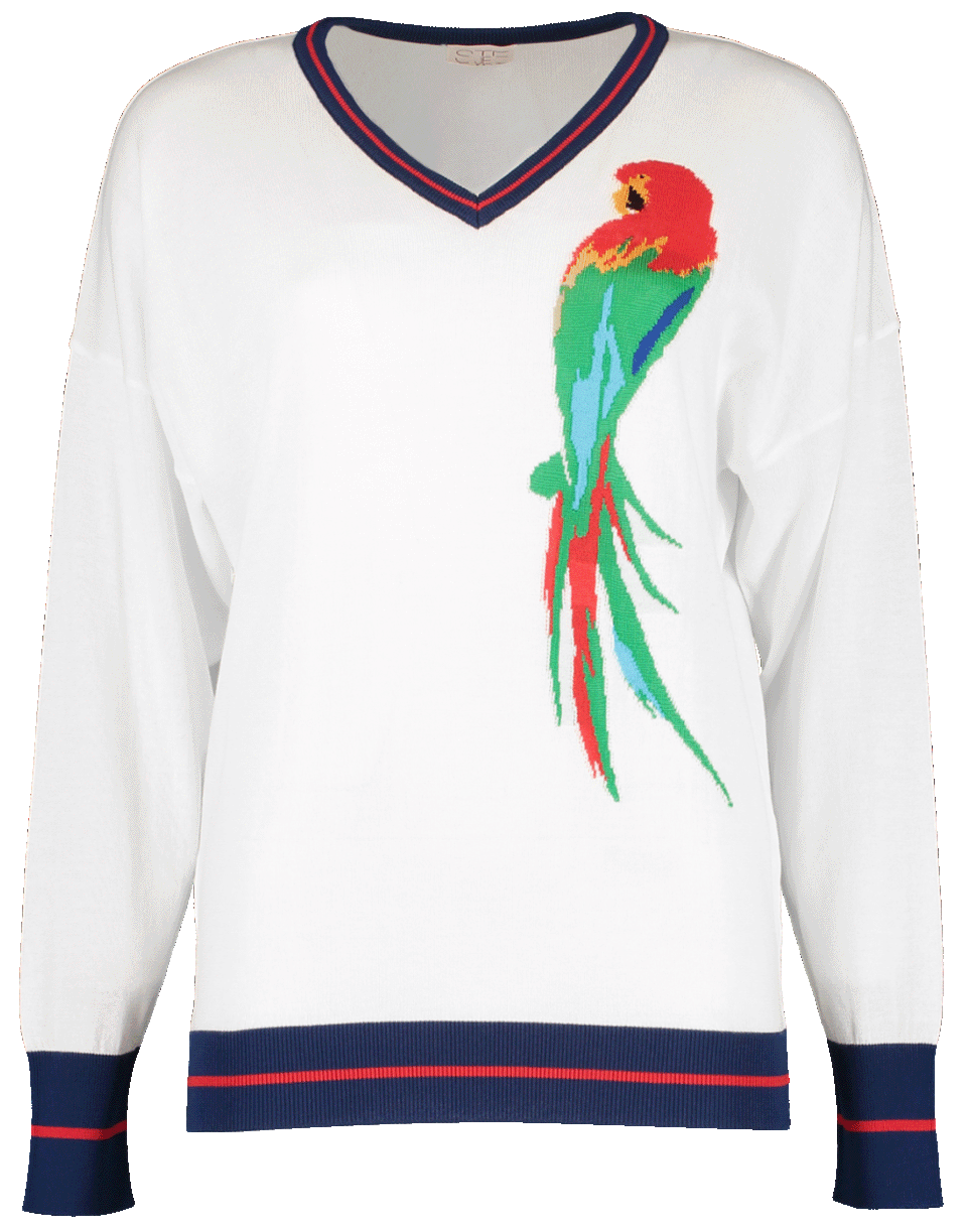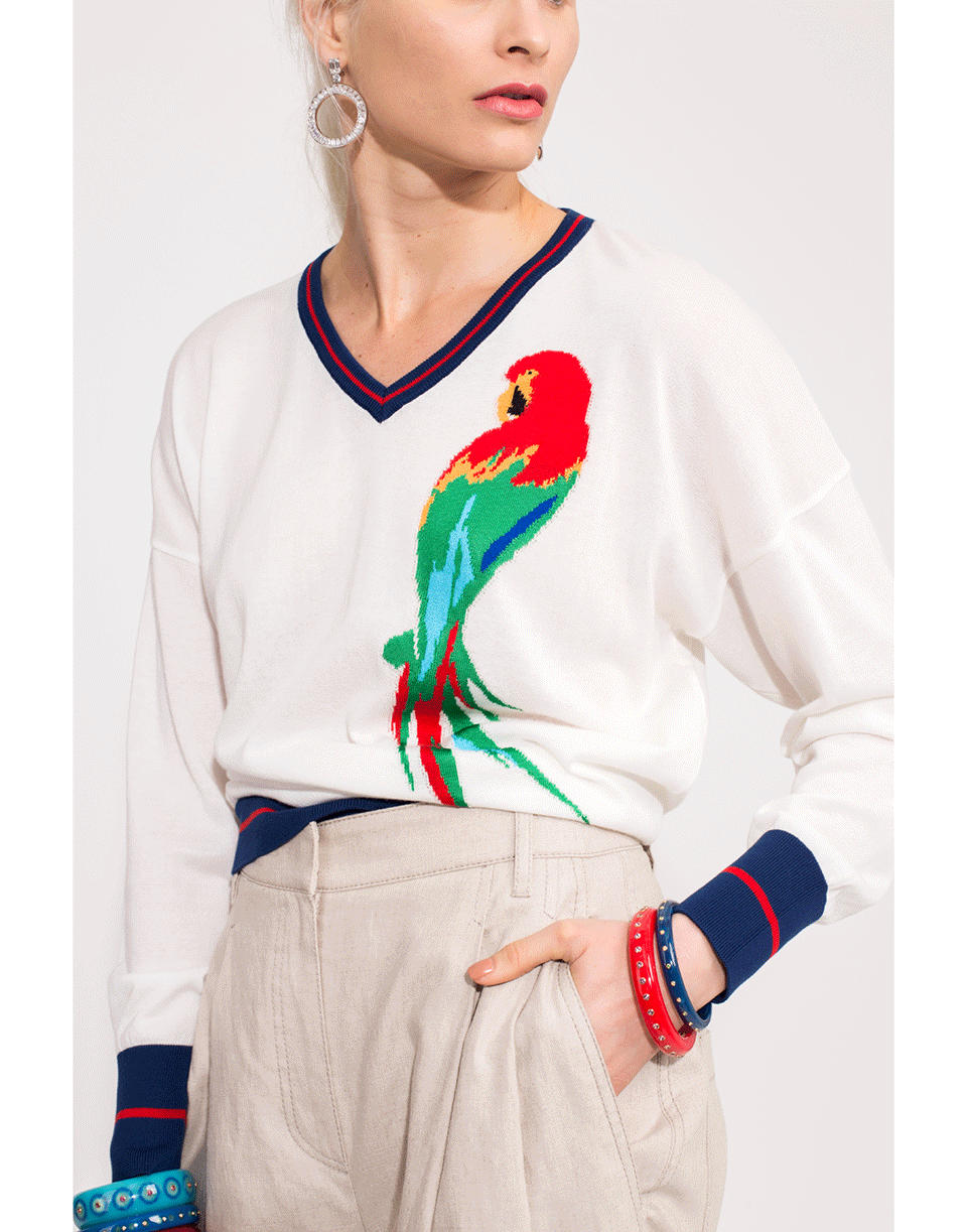 White V-neck sweater by Stella Jean. This knit pullover sweater features a v-neckline, striped trim and a vibrant multi-colored parrot motif.