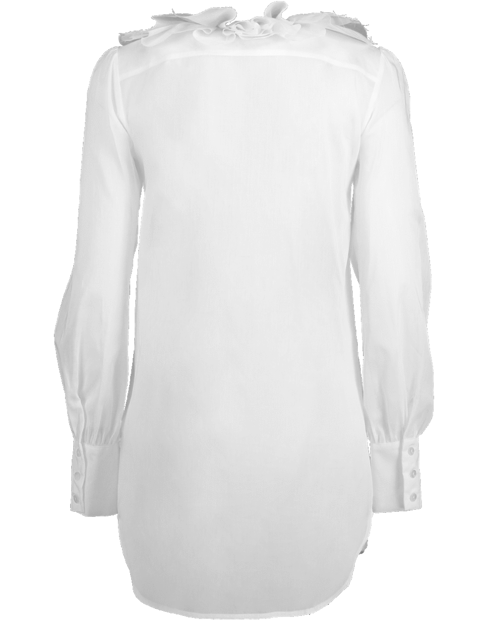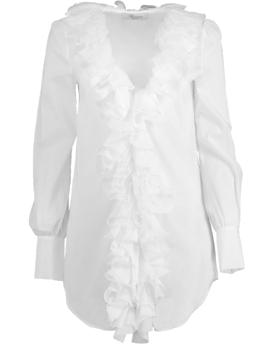 White v-neck ruffle trim blouse by Blumarine. This long-sleeve blouse features a v-neckline trimmed with flounces and lace, concealed buttons, rounded hem and button cuffs.