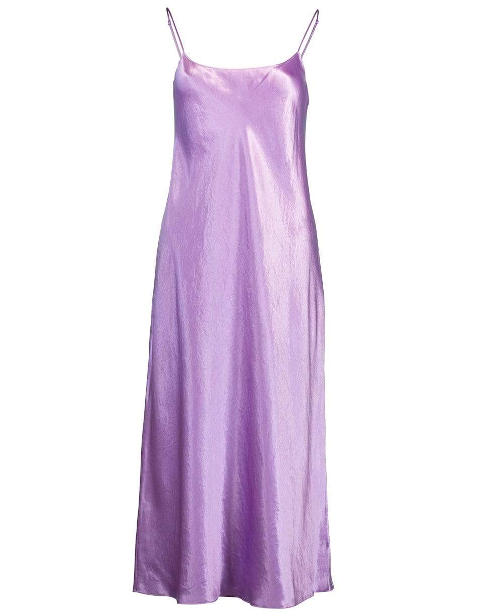 Vince Japanese satin slip dress with a scoop neck, adjustable straps, regular fit, and a midi length.