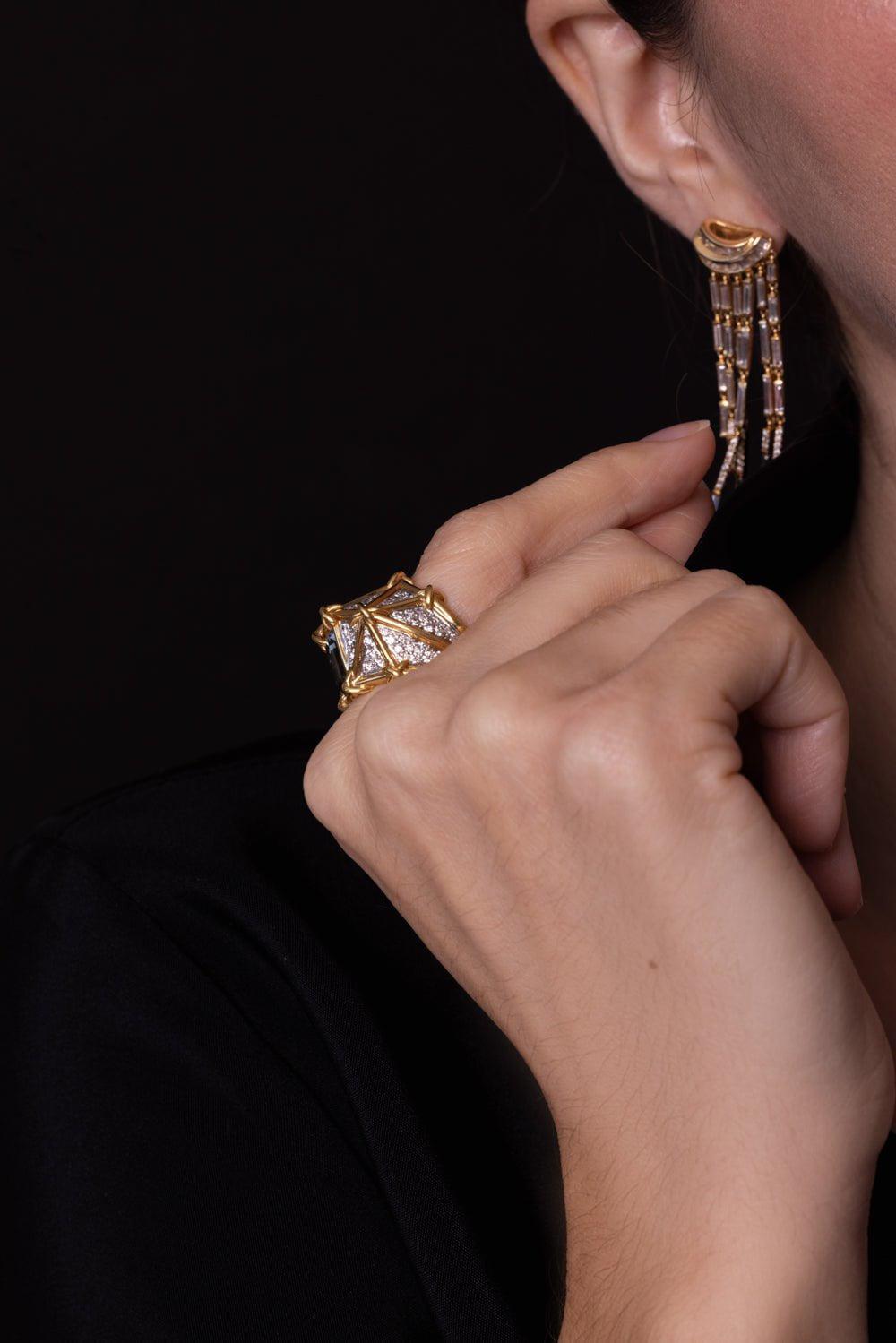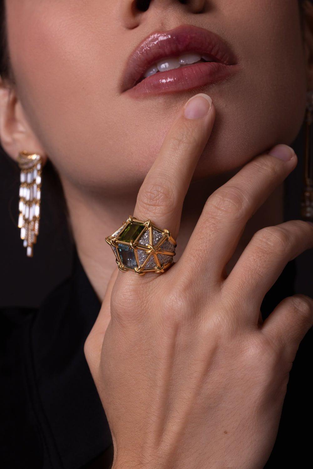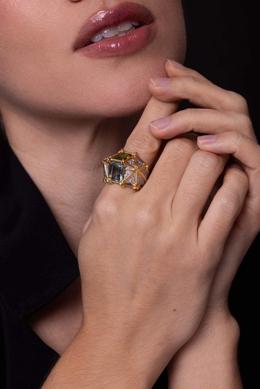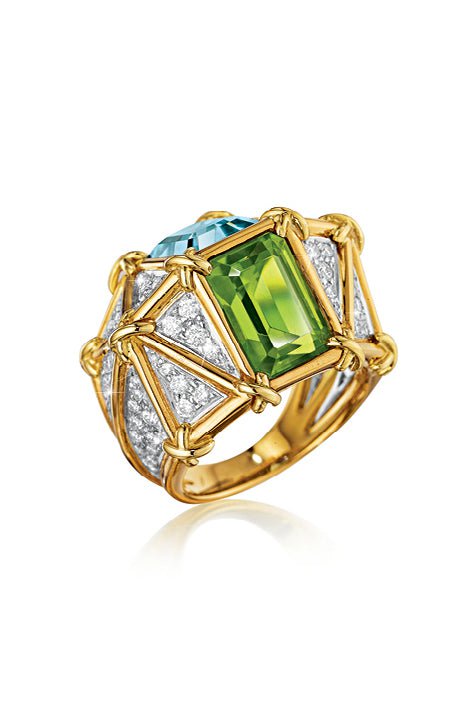 Verdura aquamarine peridot diamond ring in yellow gold.
