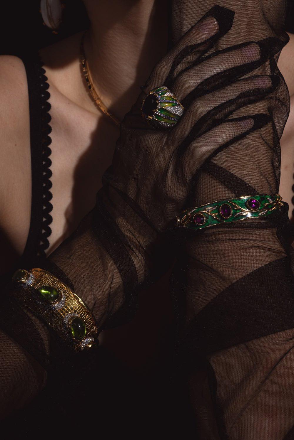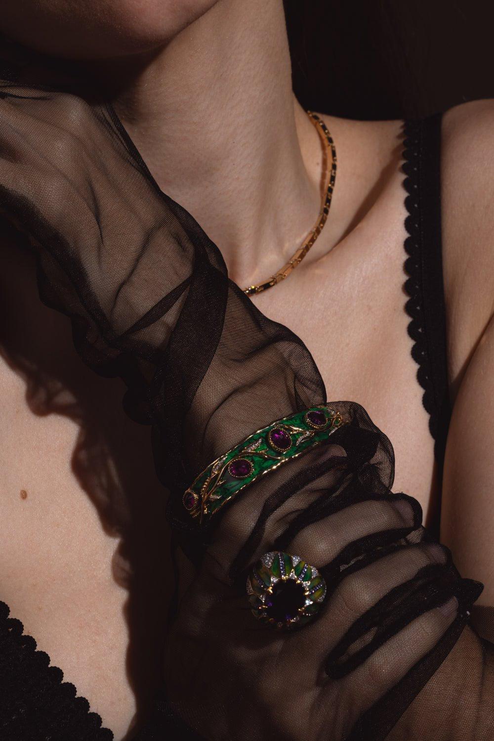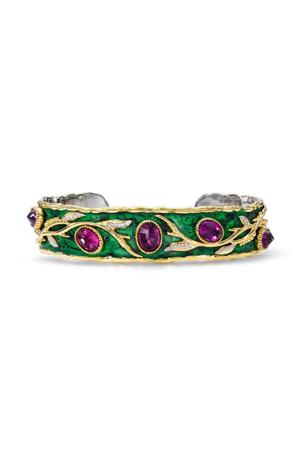 Victor Velyan purple garnet cuff bracelet in yellow gold.