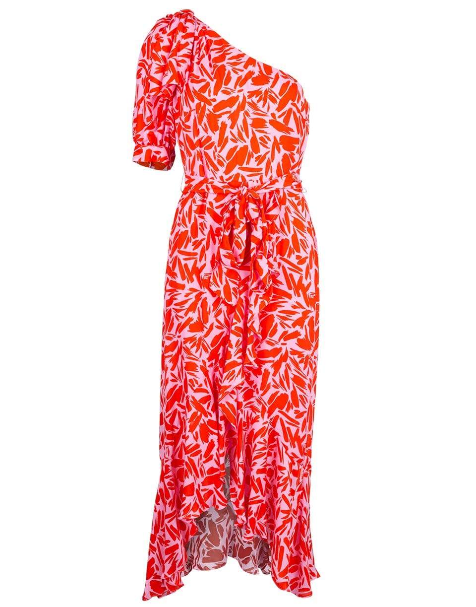 Veronica Beard poppy Vie Dress with a one-shoulder silhouette, slim waist, ruffle trim, detachable waist belt, high-low hem, and a mid-length.