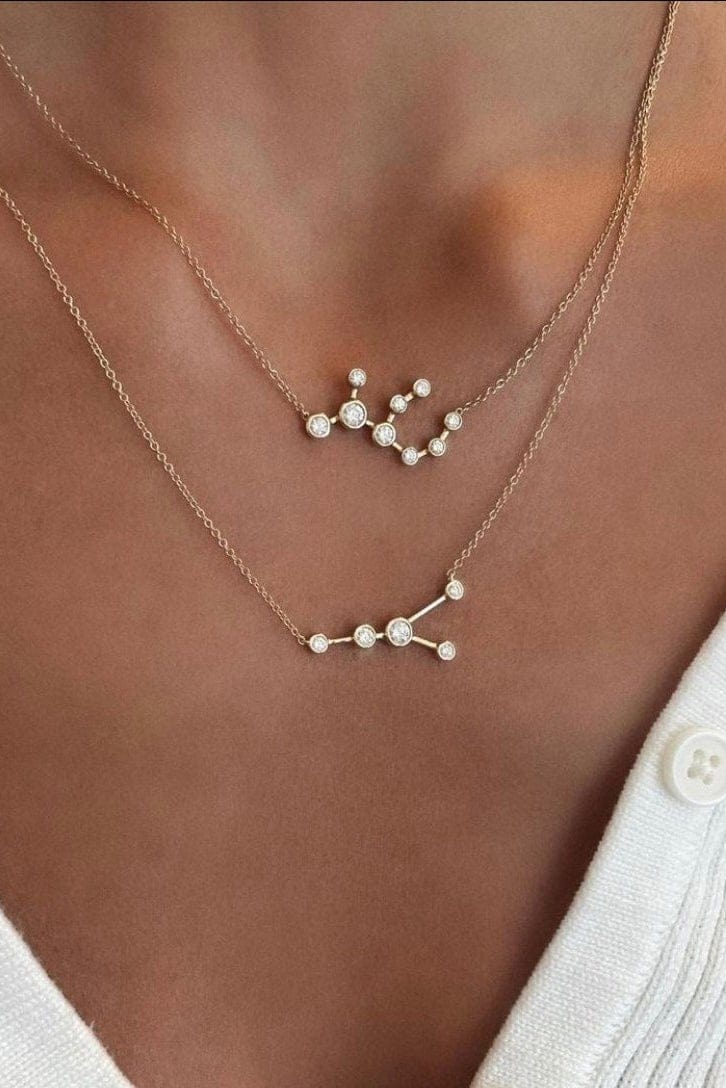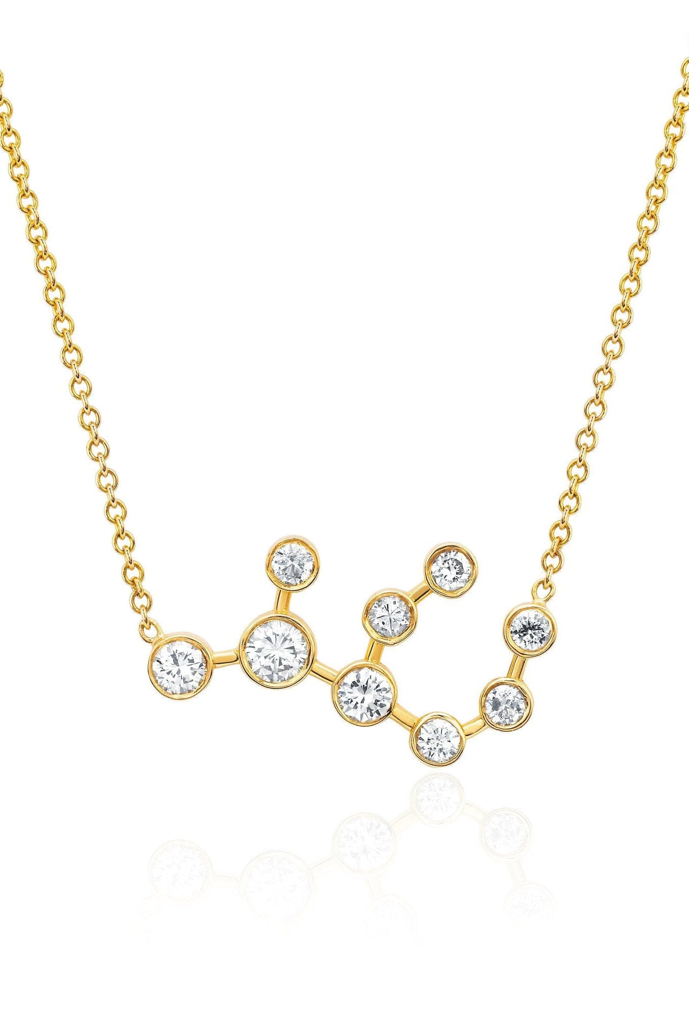 Logan Hollowell virgo constellation necklace. 14k gold and diamond constellation necklace, with .45 total carat weight. Wear your Astrological sign or the sign of a loved one. A perfect custom gift and timeless keepsake of our celestial destiny.