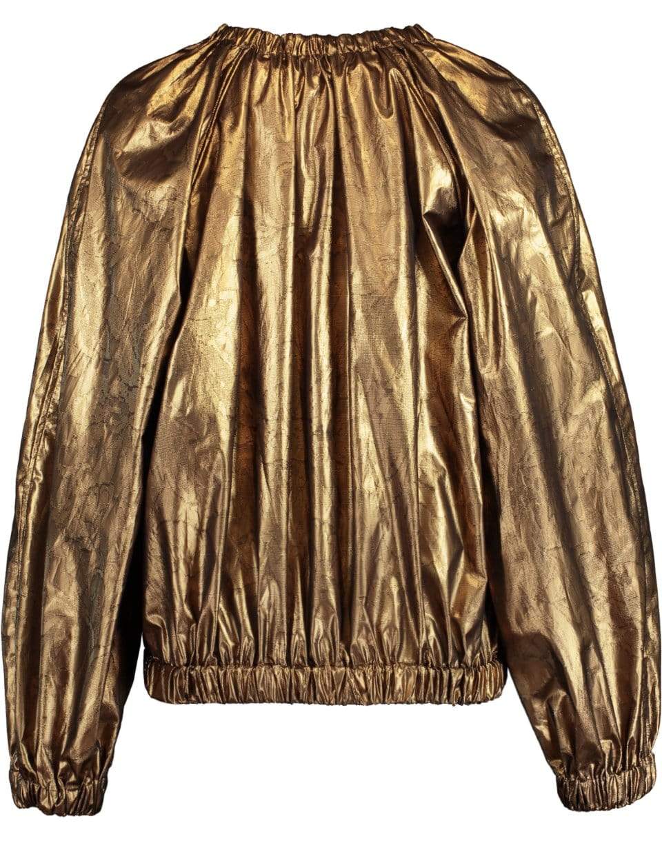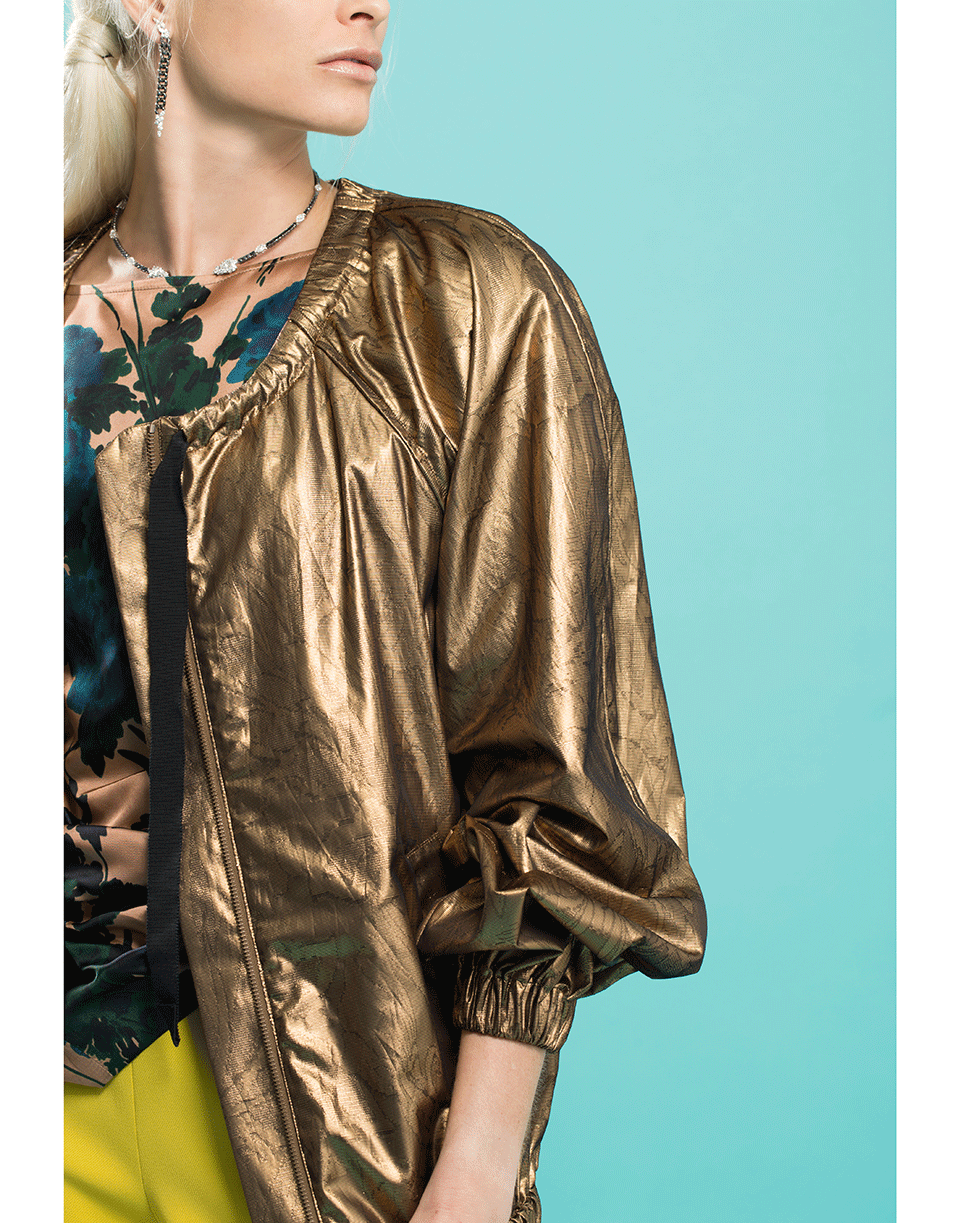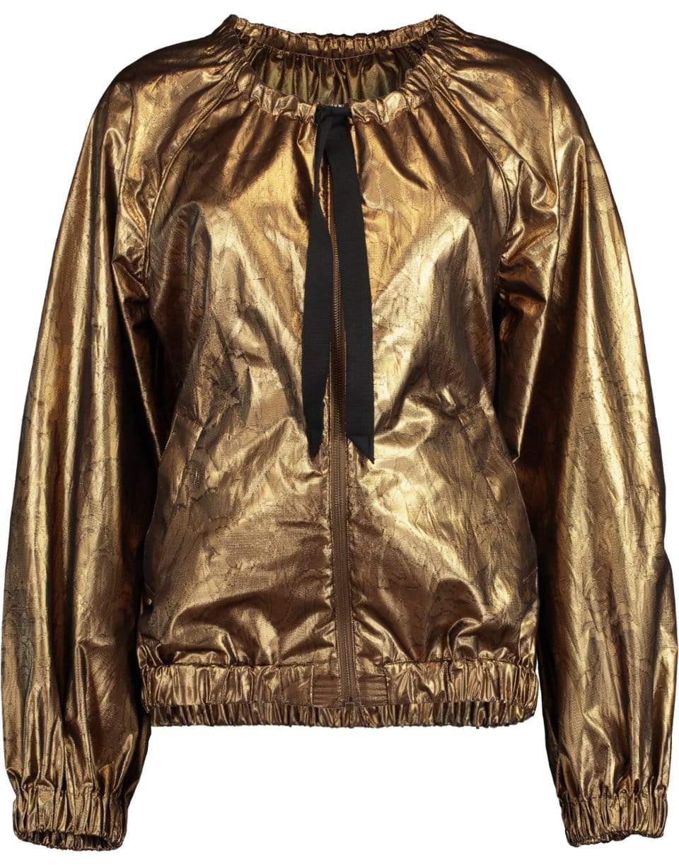 Dries Van Noten Volvada metallic jacket featuring a regular fit, round neckline with ribbon drawstrings, long sleeves, zip front, side pockets, and elastic trims.
