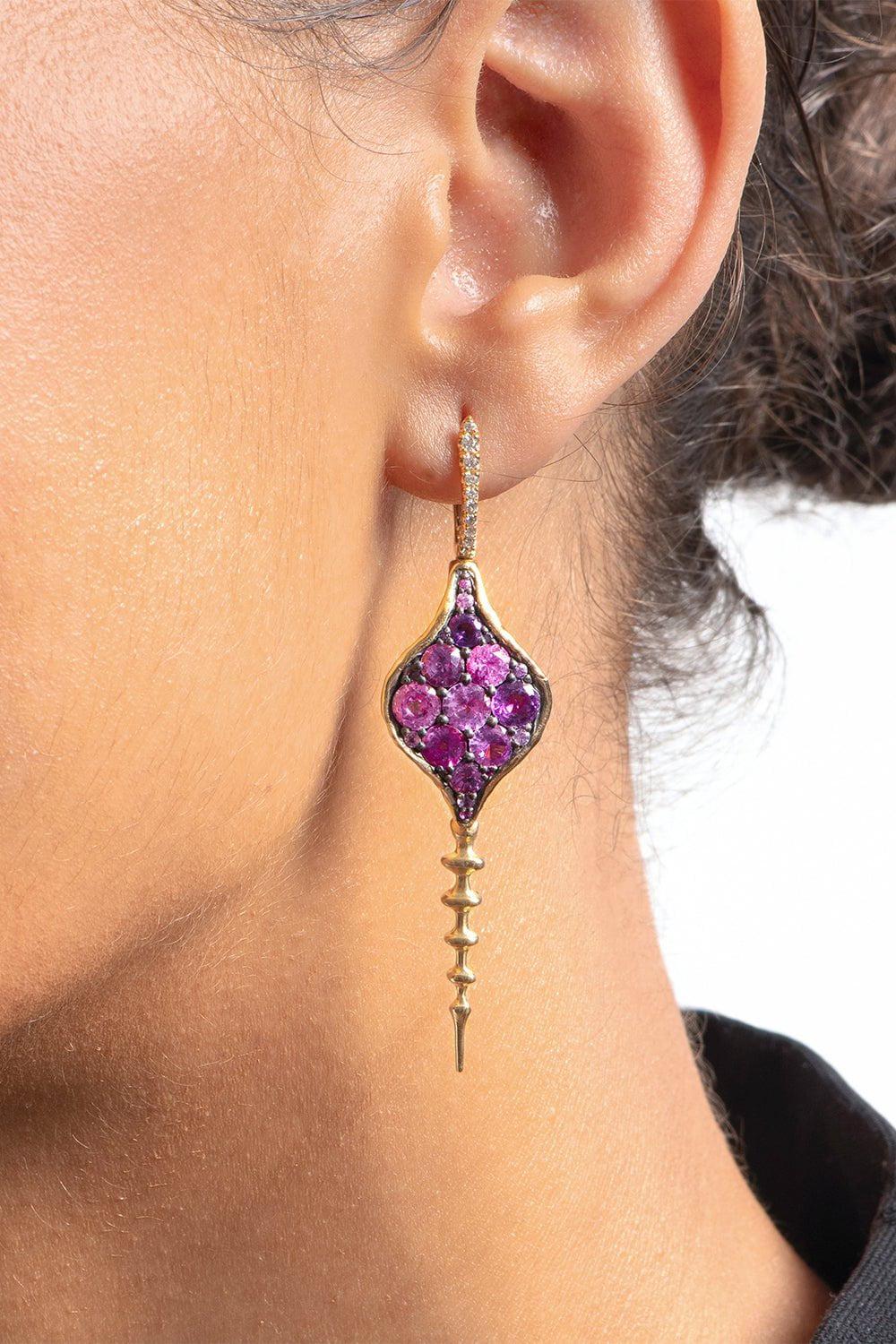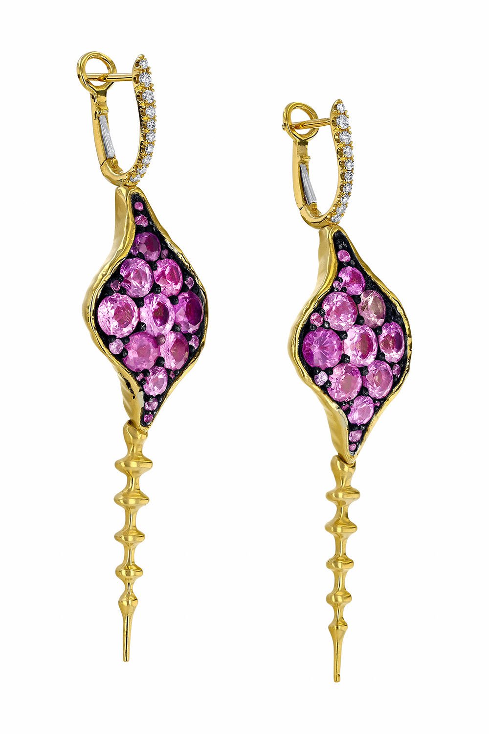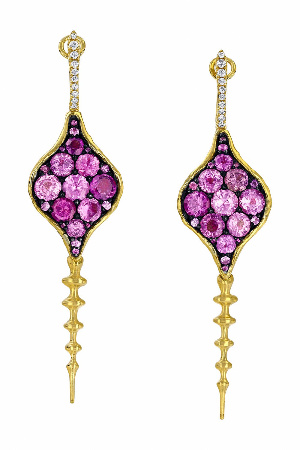 Vram chrona diamond pink sapphire earrings in yellow gold.
