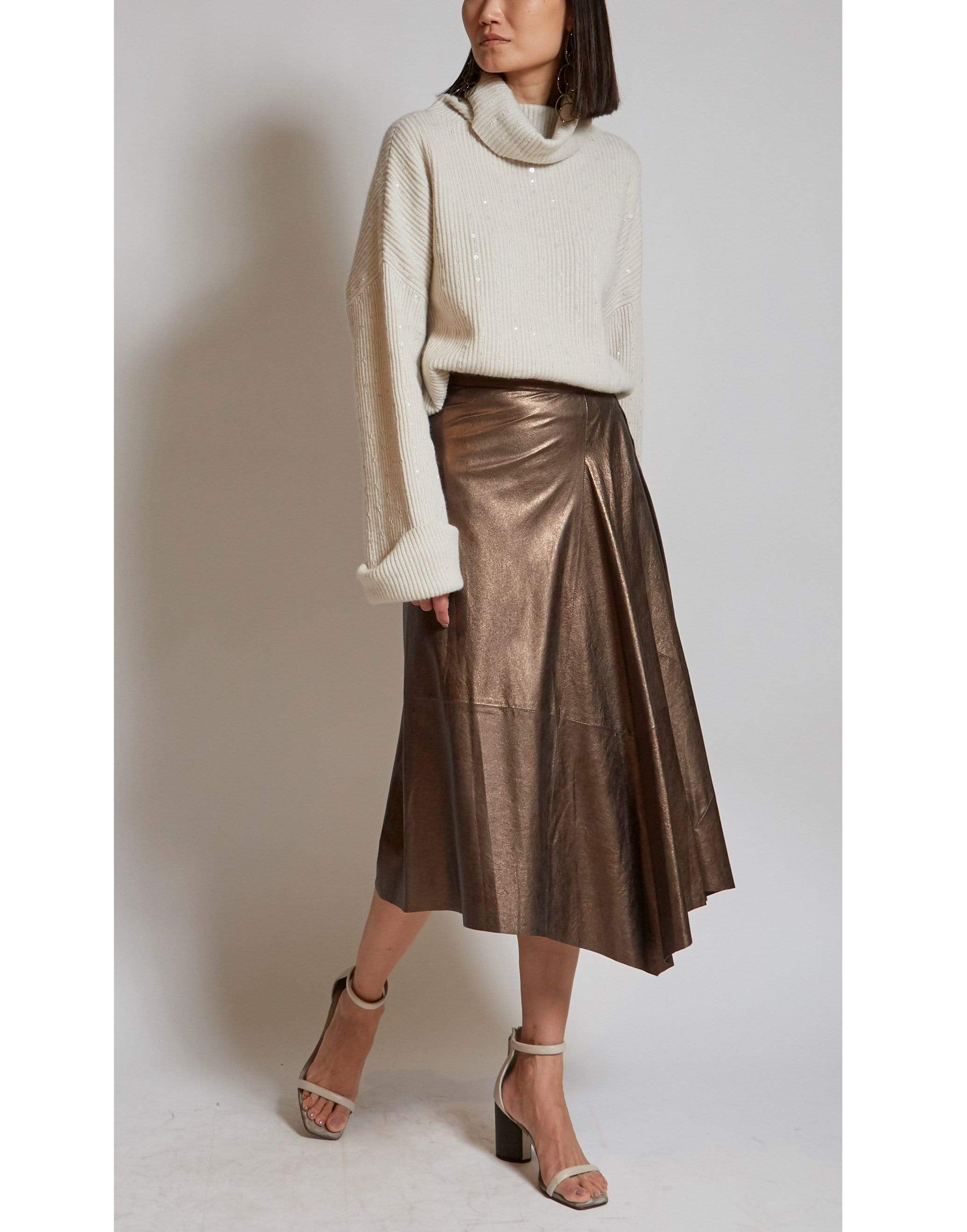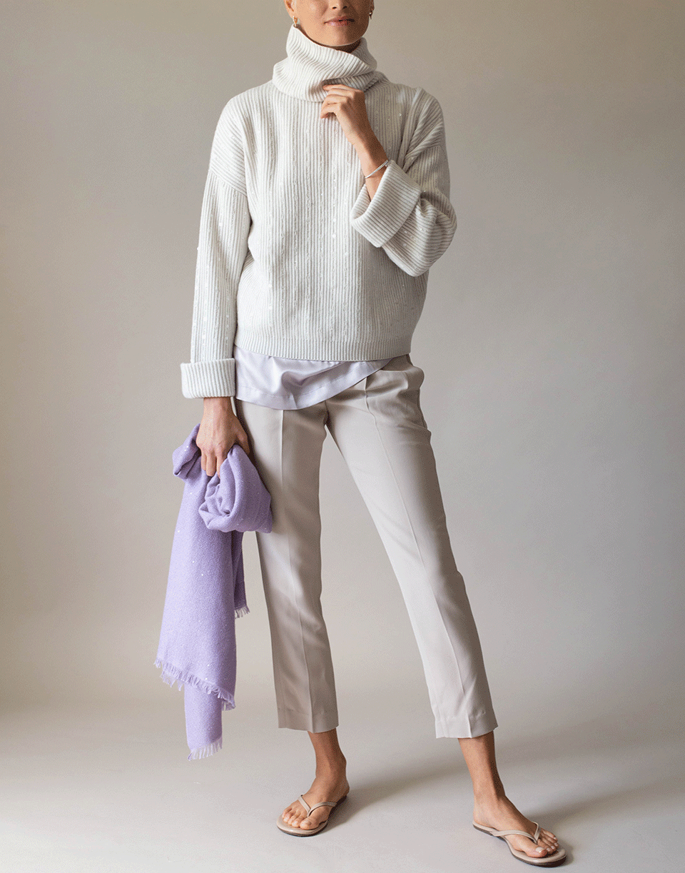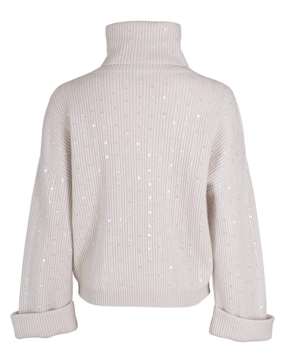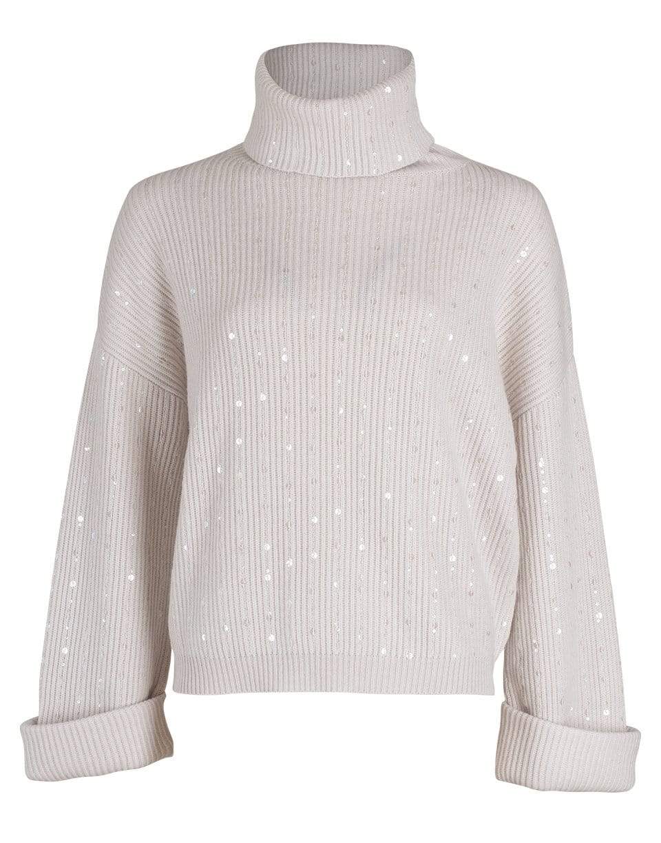 Brunello Cucinelli warm white cashmere English ribbed cuffed turtleneck with paillette embellishments and a relaxed fit.