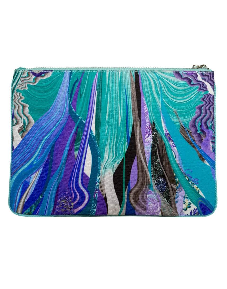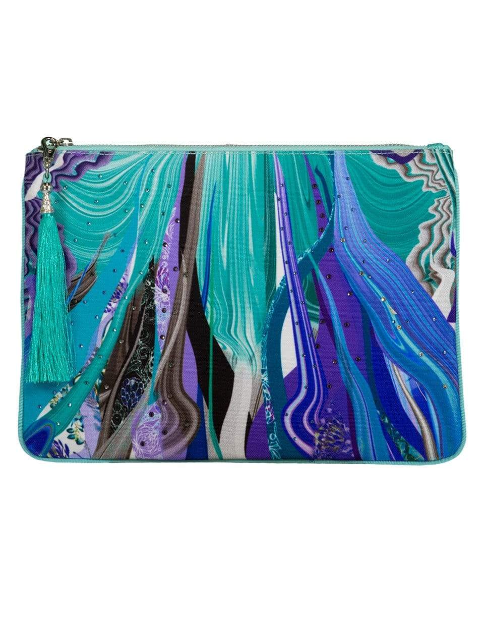 Wategos Wanderlust small canvas clutch from Camilla featuring a flat silhouette with a zip top, embroidery accents, a detachable tassel, and an internal zip pocket.