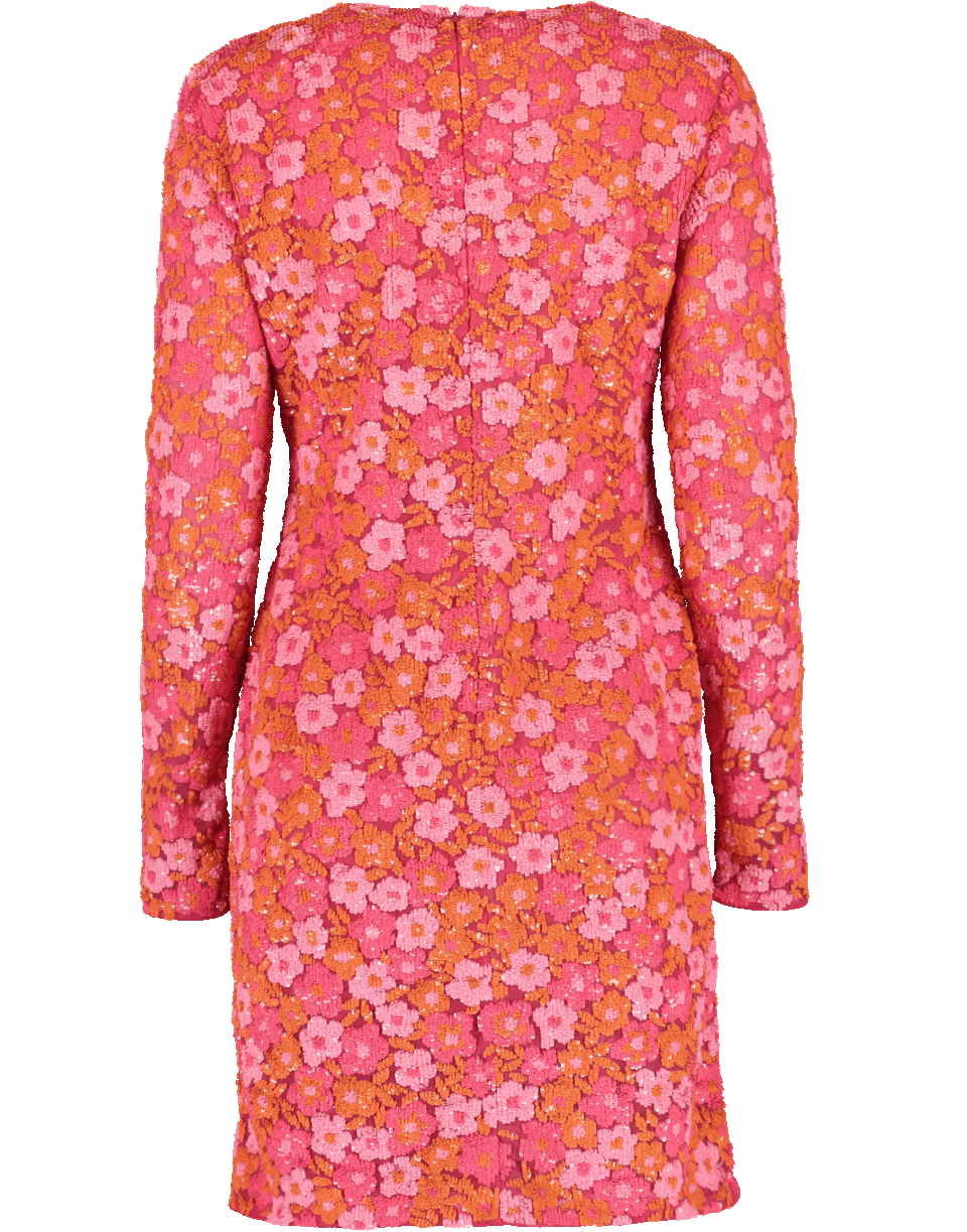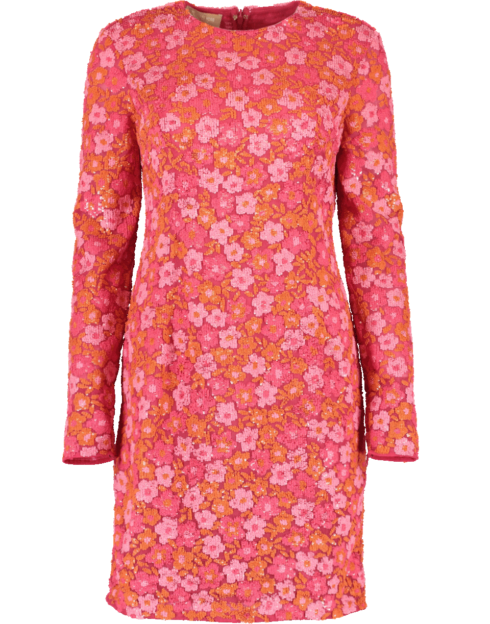 This Long-Sleeved Embroidered Dress by Michael Kors features a round neckline, back zip closure and a pink and yellow floral print motif with sequins throughout.