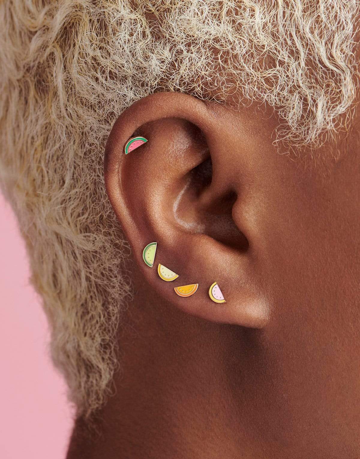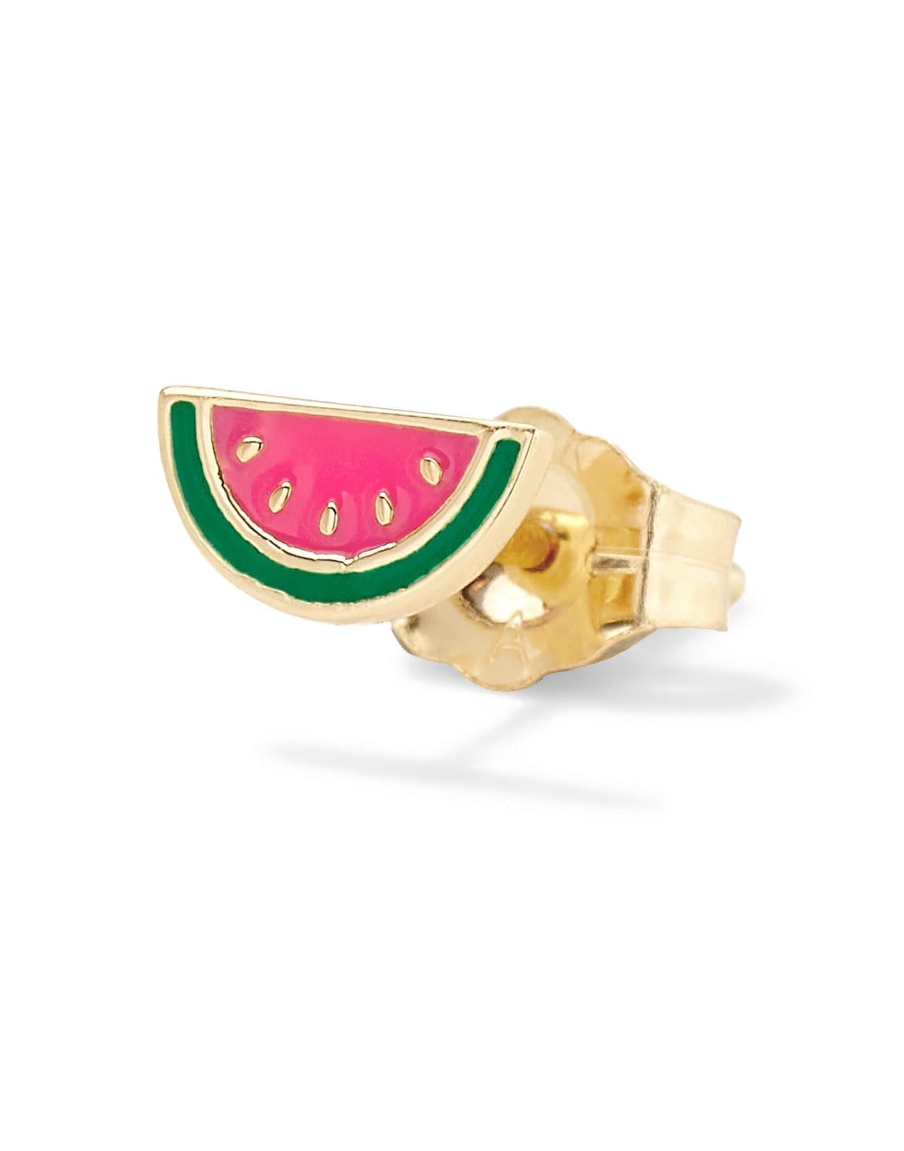Alison Lou Watermelon stud. Get juicy with our 14k yellow gold watermelon stud featuring pink and green enamel.