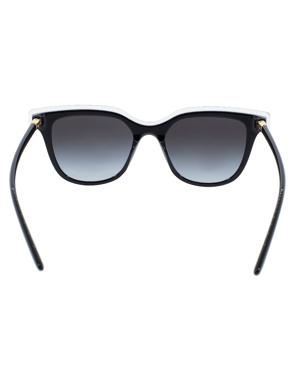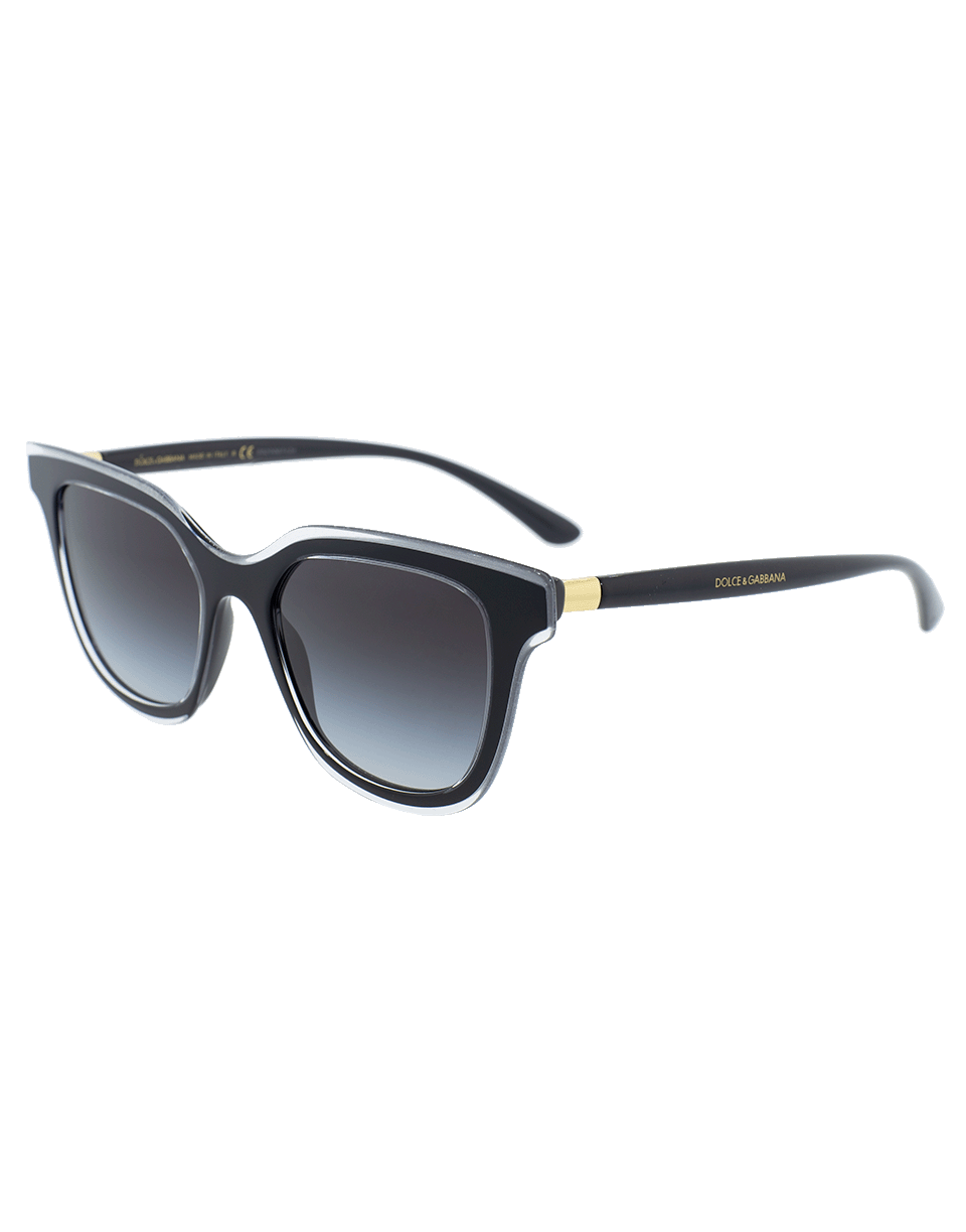 Black wayfarer sunglasses by Dolce & Gabbana. These sunglasses feature a square shape with a full acetate rim and gold-tone hardware.