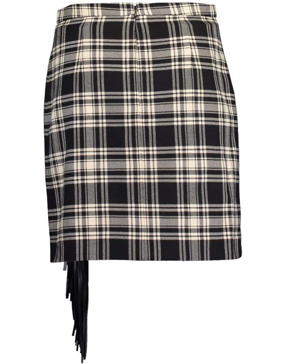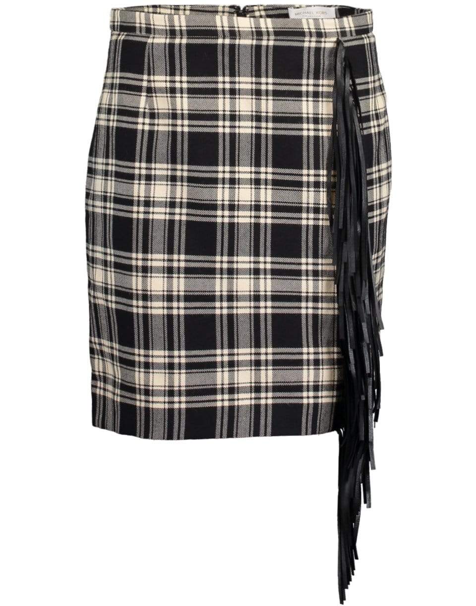 Michael Kors western tartan wool skirt with leather fringe, high waist, concealed back zip closure, and a short length.