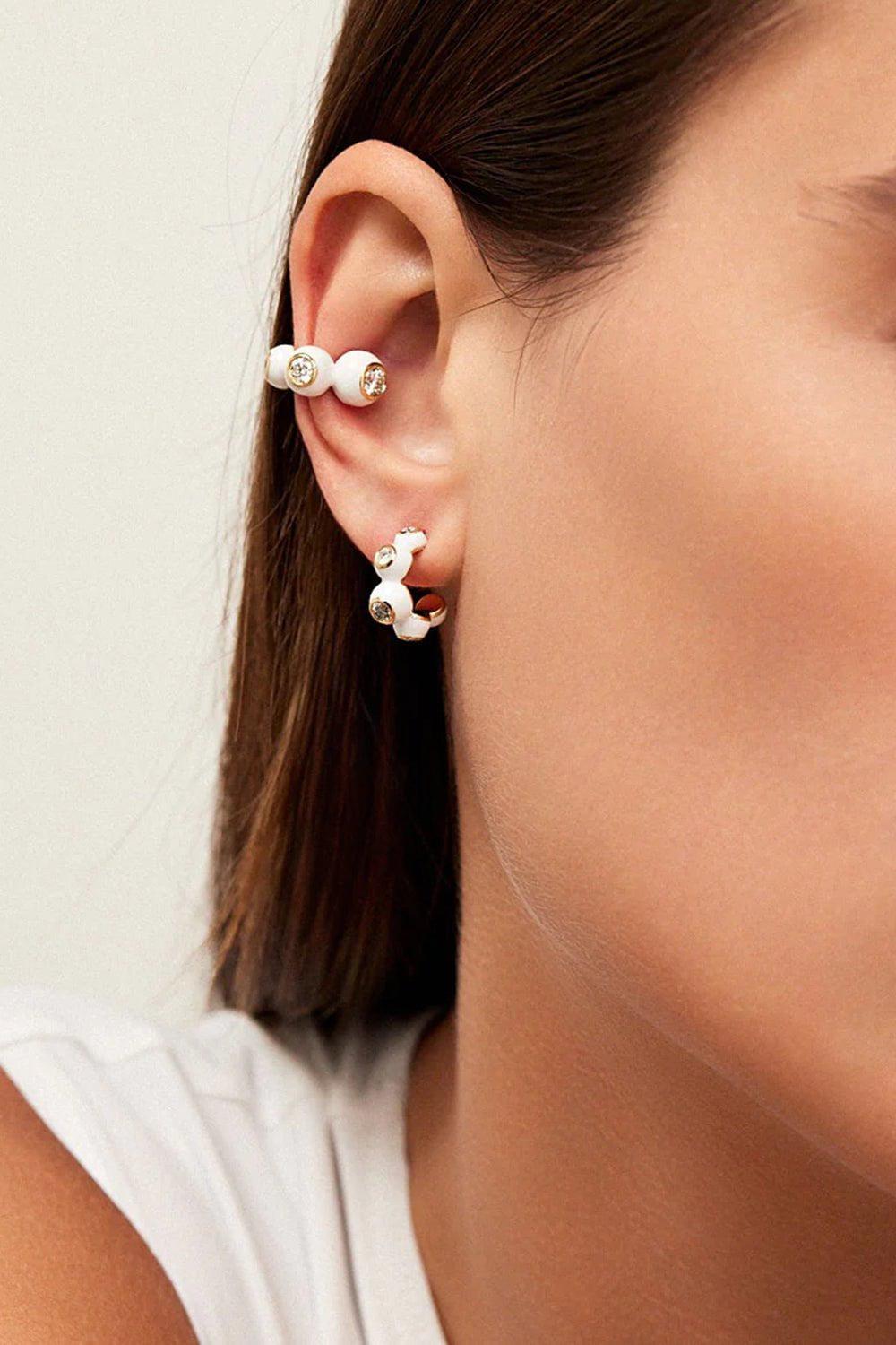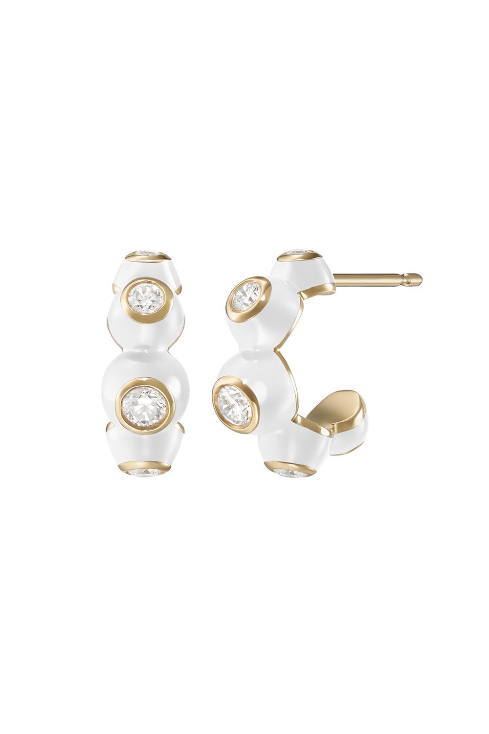 Melissa Kaye white audrey diamond huggie hoop earrings in yellow gold.