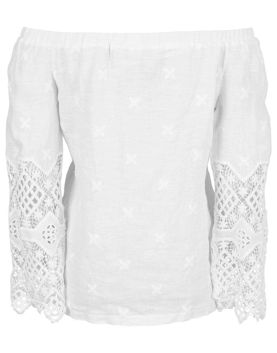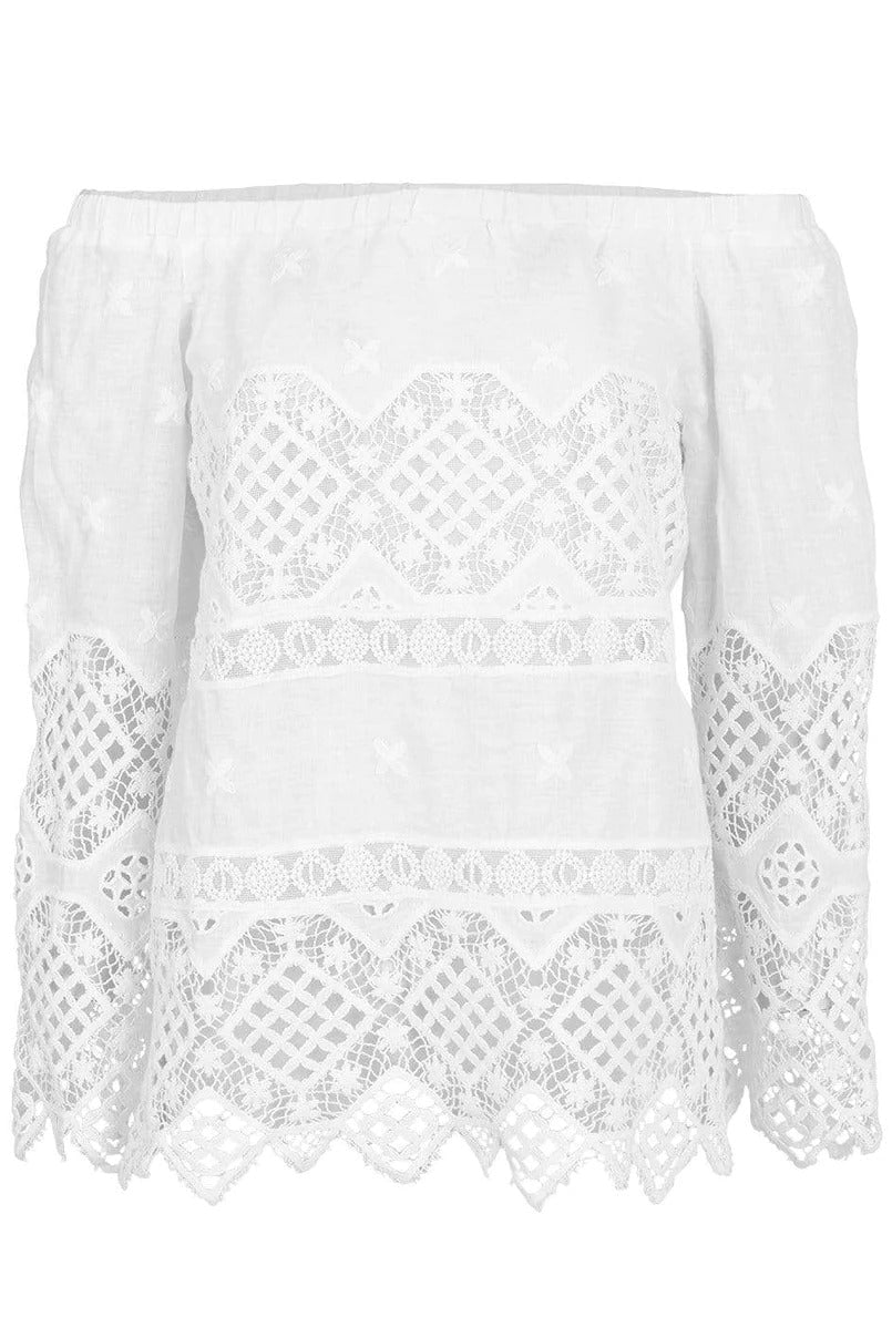 Tempation Positano Buenos Aires top in white featuring an off the shoulder style, long sleeves, crochet details, and a regular fit.