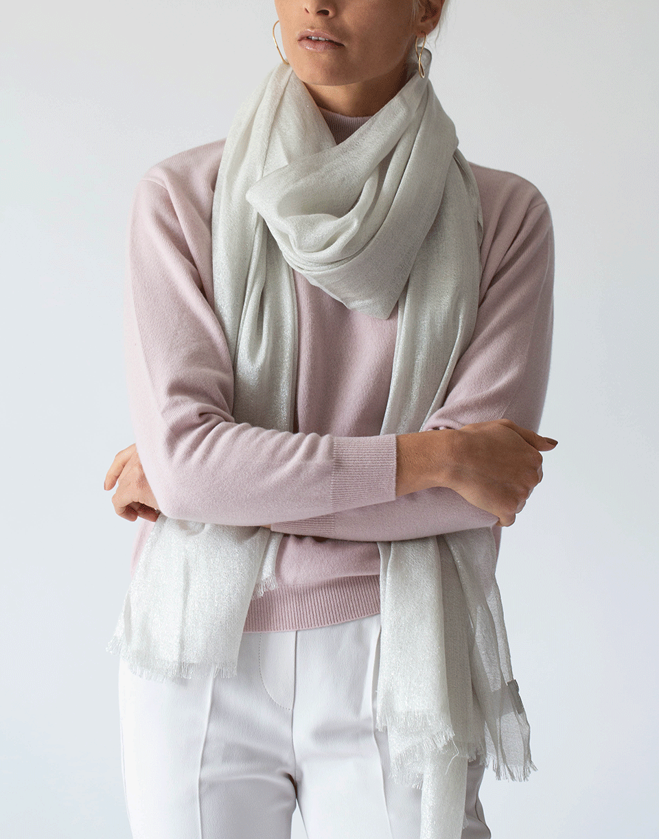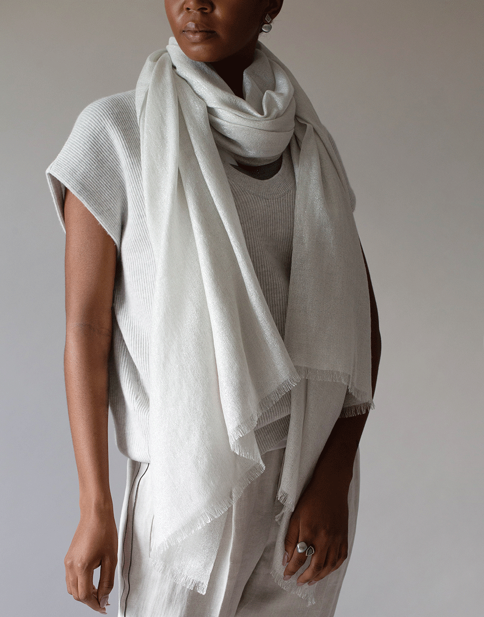 Brunello Cucinelli white cashmere, silk, and lurex scarf.