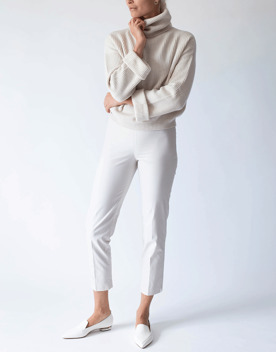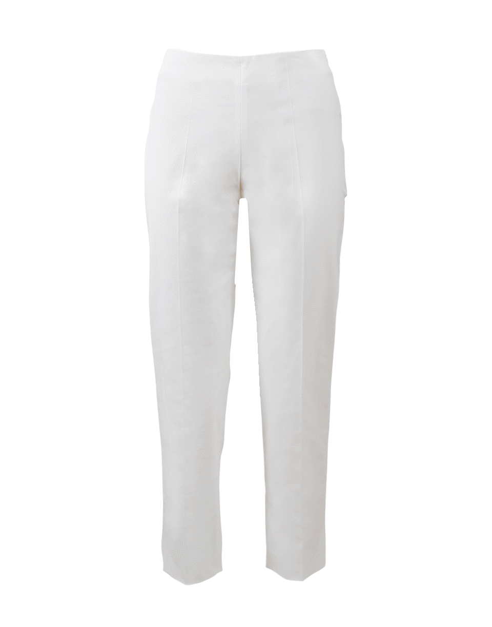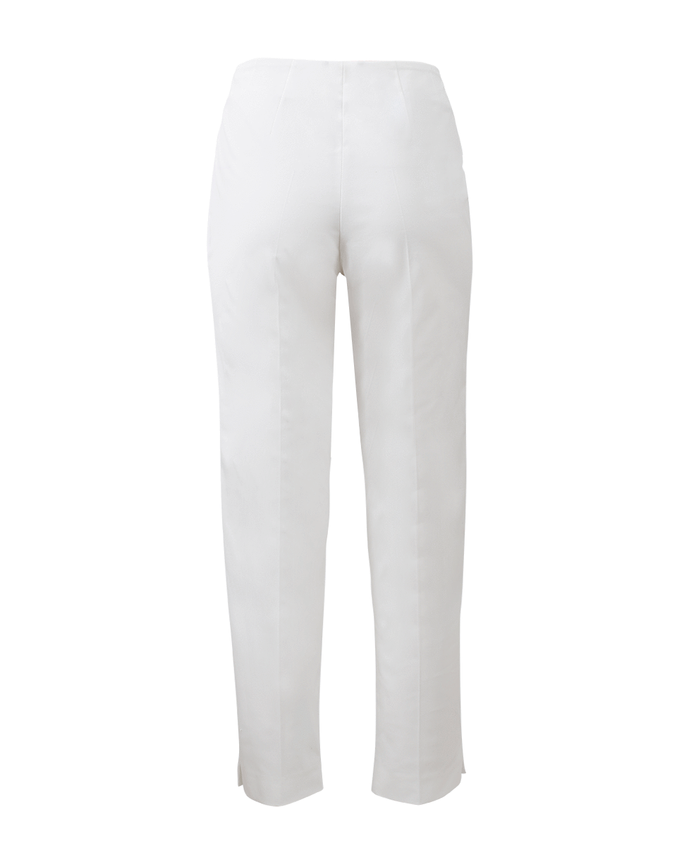 Brunello Cucinelli white cotton side zip pant with a mid-rise waistline, side zip closure, back dart detail, leg vents, slim leg and a cropped cut.