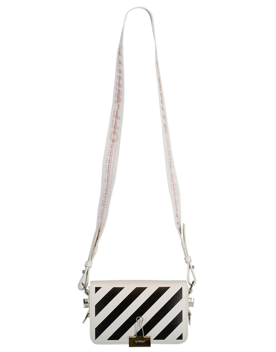 Off-White Diag mini flap bag with a detachable industrial shoulder strap, black diagonal print, magnetic closure, interior card slots, zip compartment, and a detatchable binder clip at front.