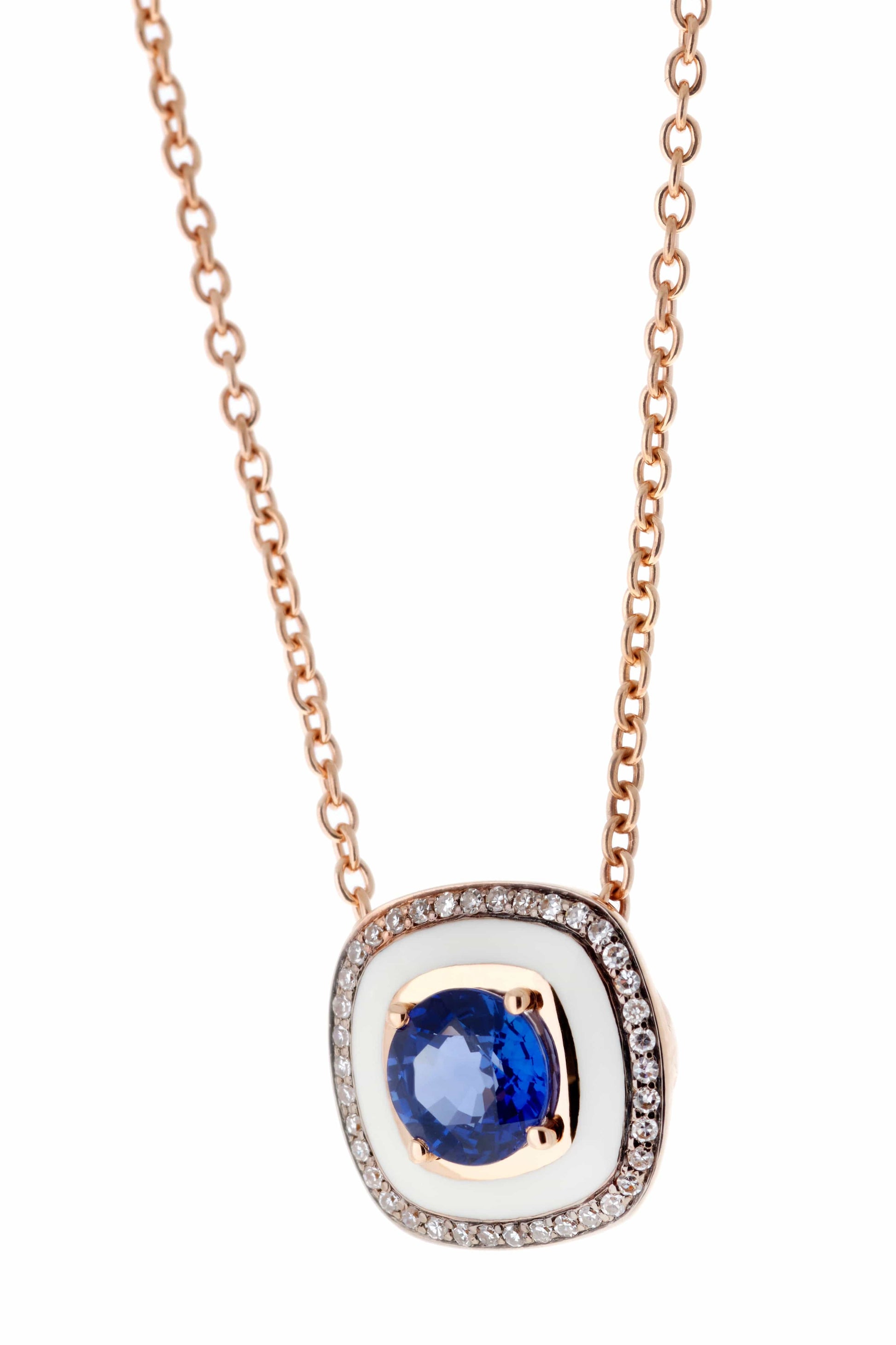 Selim Mouzannar pendant in pink gold and white enamel set with diamonds and blue sapphire.