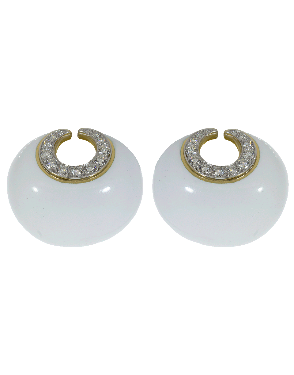White enamel diamond earrings with brilliant-cut diamonds, platinum and 18k yellow gold. For pierced ears.