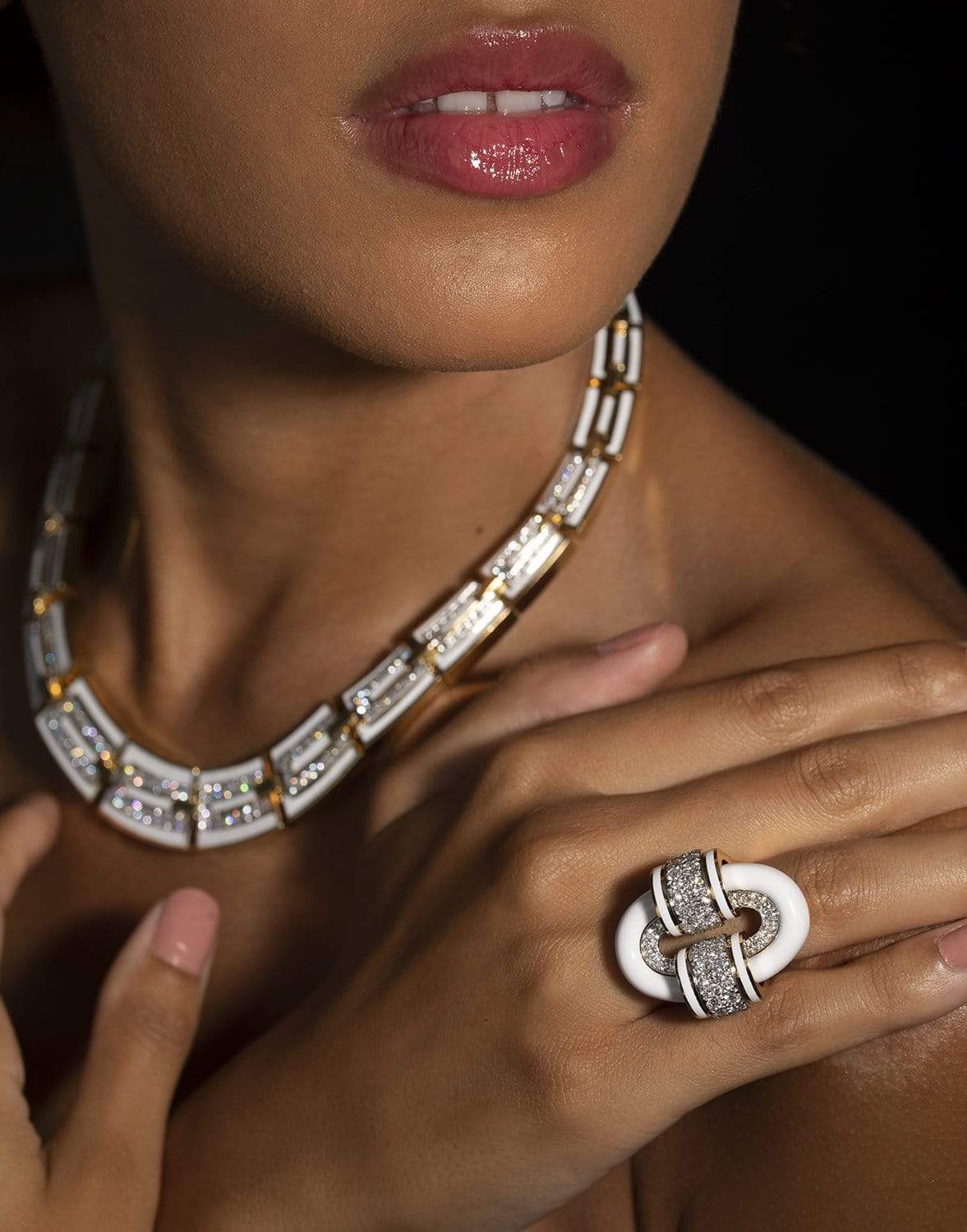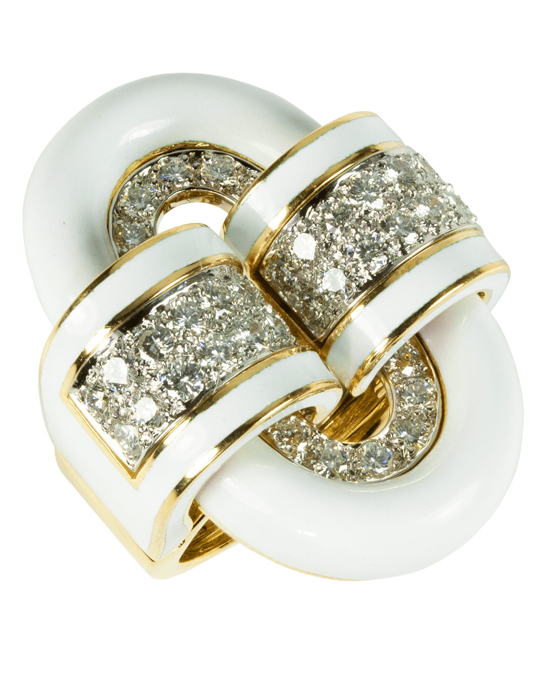 David Webb oval buckle ring with white enamel and brilliant cut diamonds.