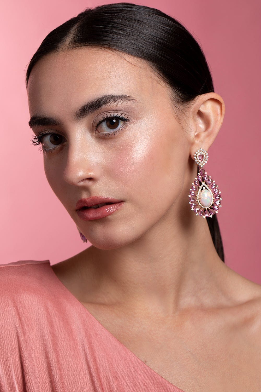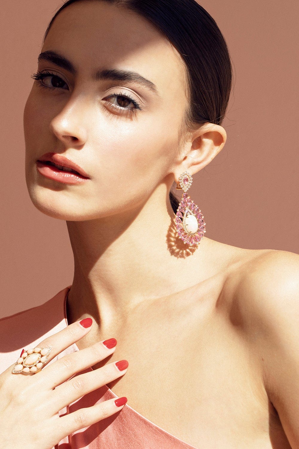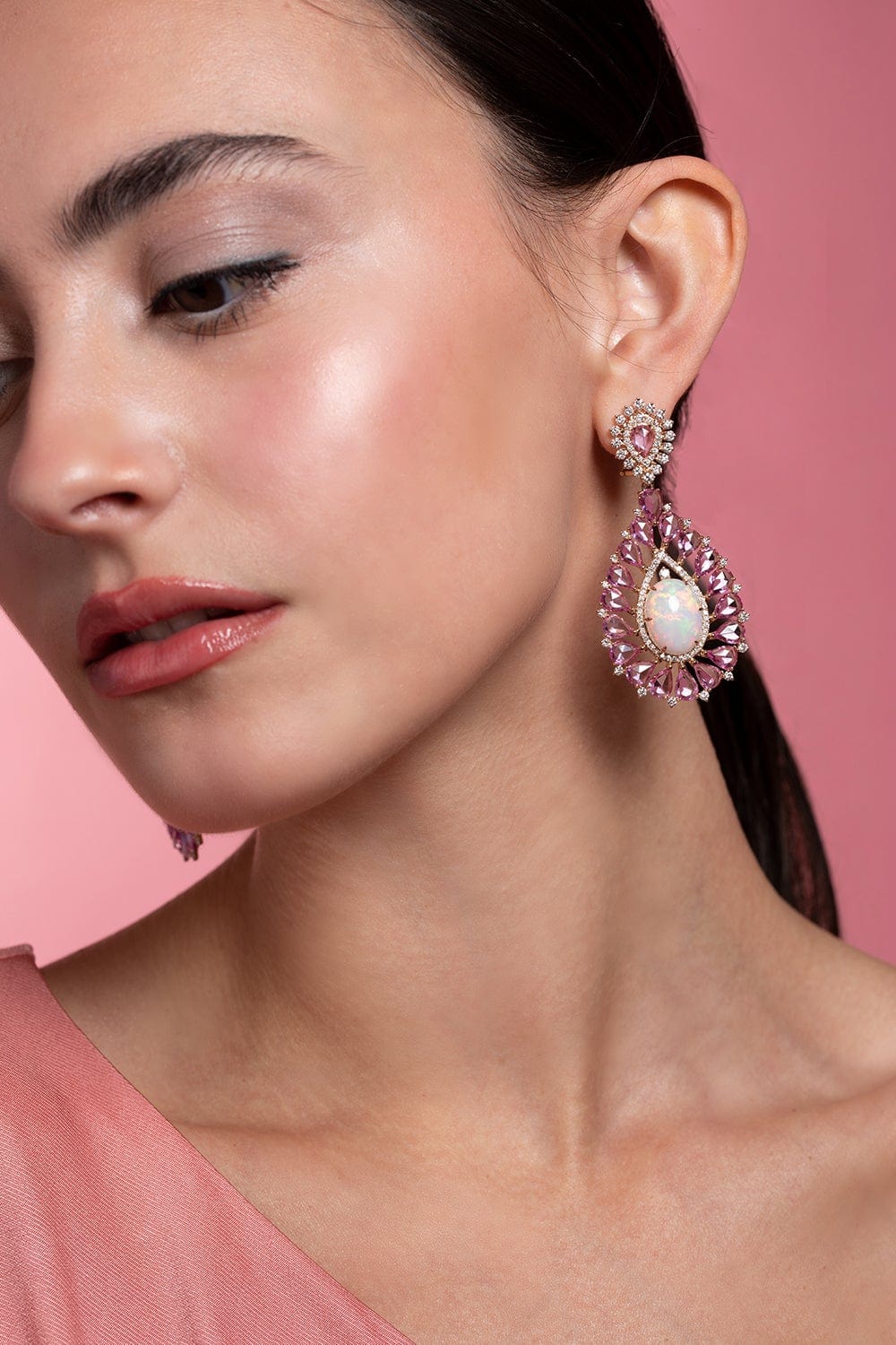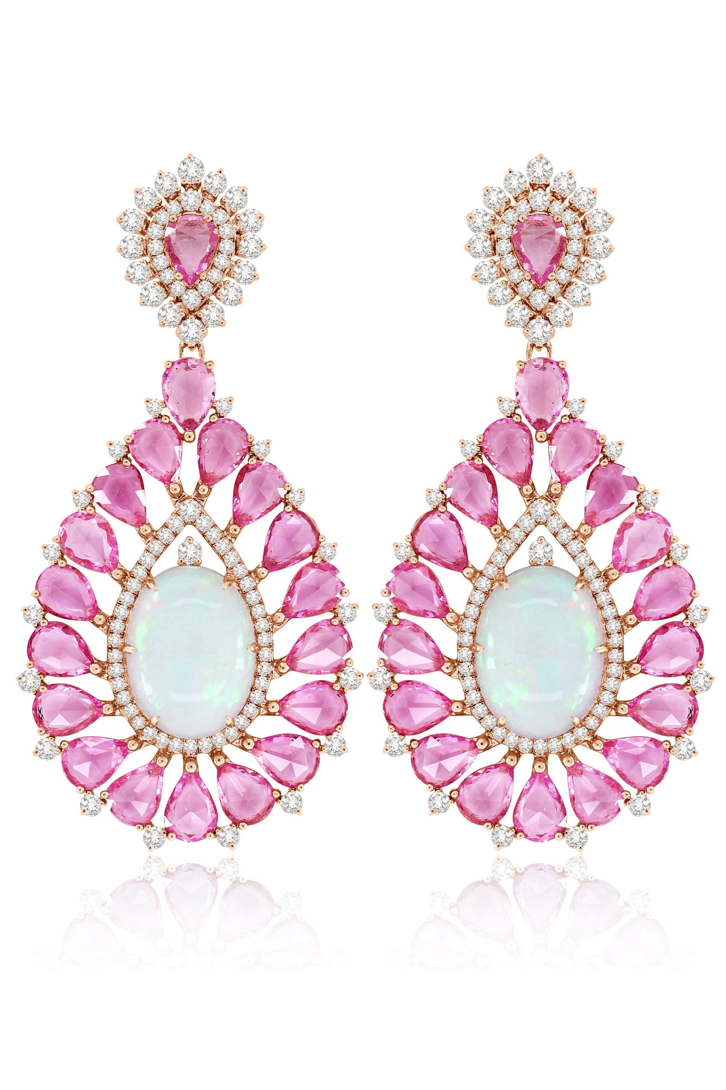 Sutra 18k rose gold earrings with white opal, pink sapphire, and round diamonds.