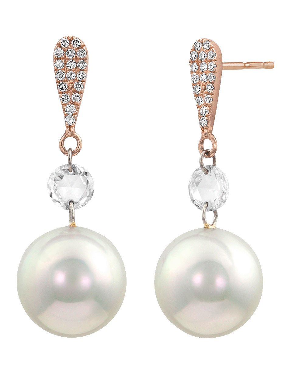 These striking 14k rose gold earrings from Baggins feature a diamond-set tear drop top, rose cut diamond accent in the middle and an Akoya cultured pearl drop.