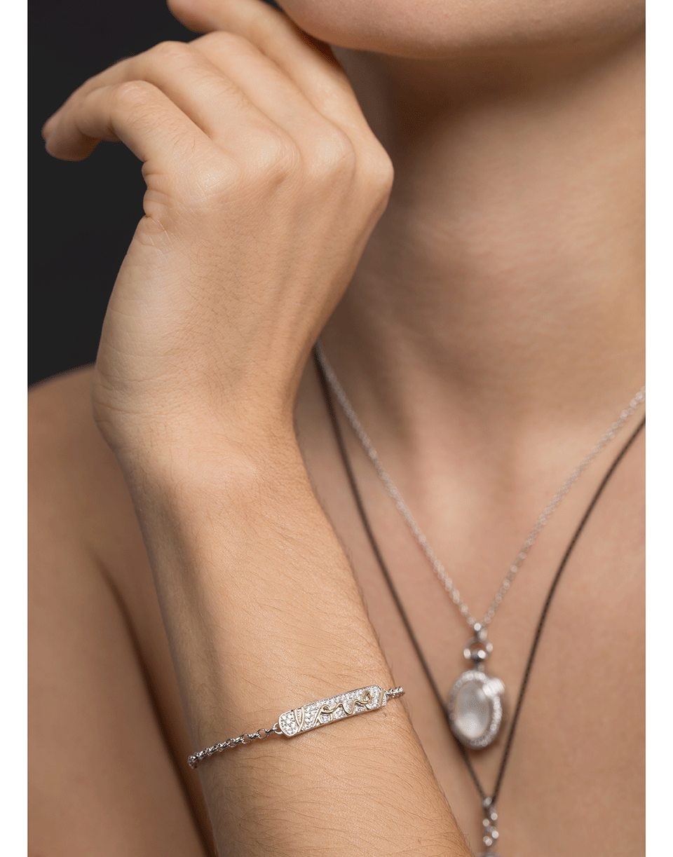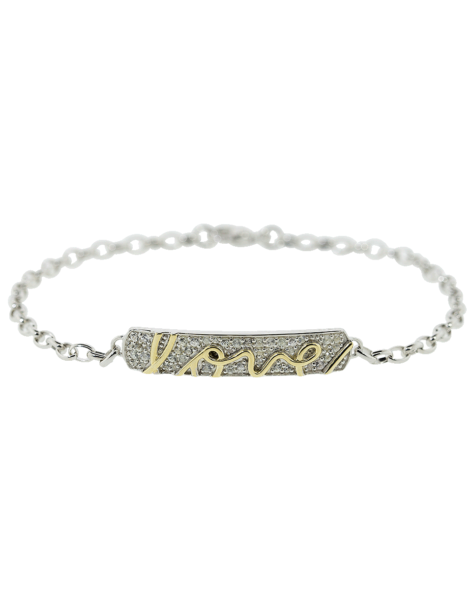 Monica Rich Kosann sterling silver bracelet with a 'love' engraved plate and white sapphire.