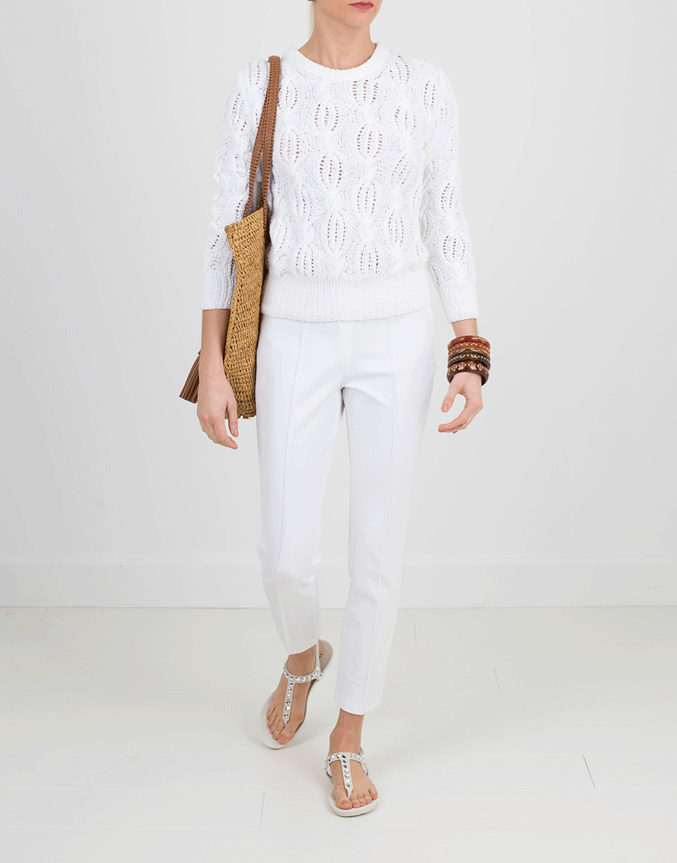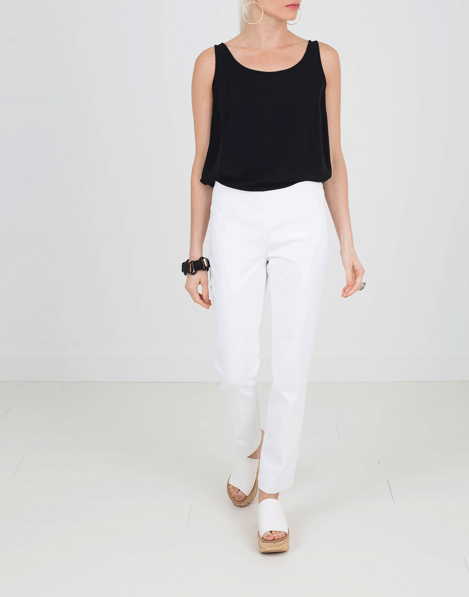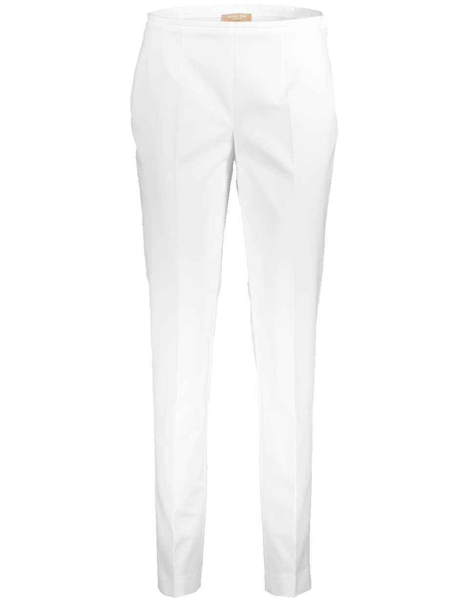 Michael Kors white side zip pant with a high-rise, side zip closure, slim leg and ankle length.