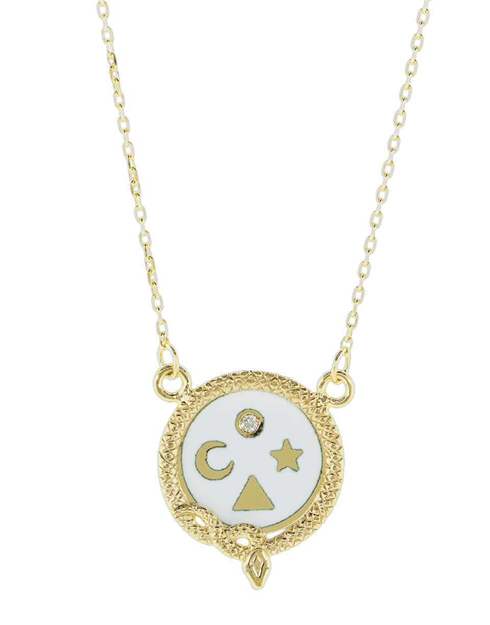 The snake on the Wholeness medallion by Foundrae is a symbolic sign of rejuvenation and is meant to encourage the wearer to seek unity within through growth and balance. It hangs from an 18k yellow gold chain with a lobster clasp closure.