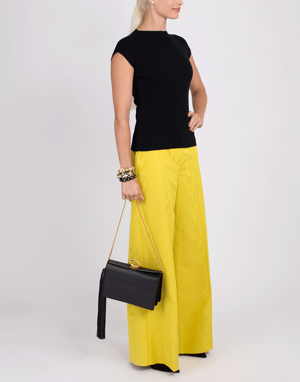 These cotton blend pants from Oscar de la Renta offer a bright hue just in time for summer. They feature a high waist with a front tab and zipper closure, two side slash pockts, and a very on trend full length wide leg.