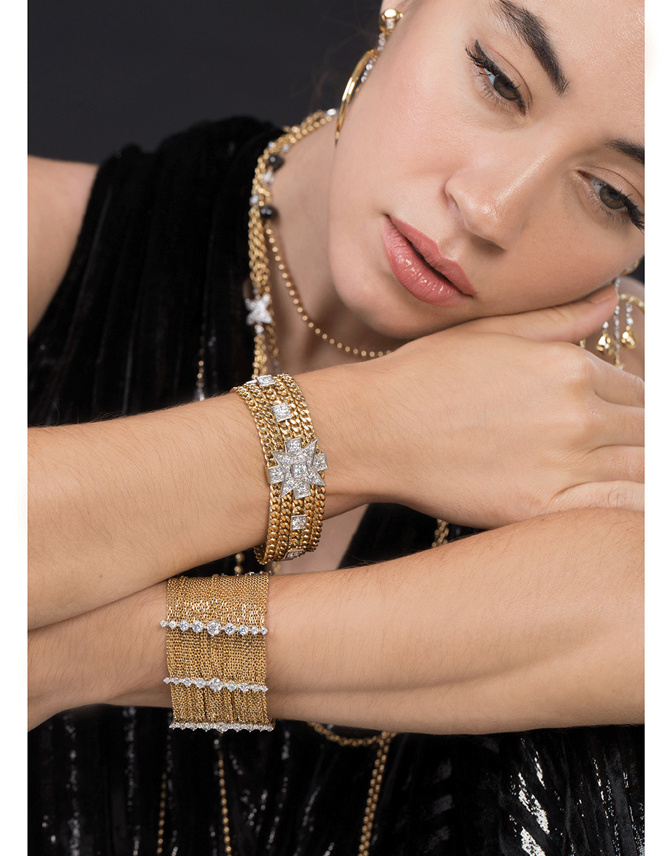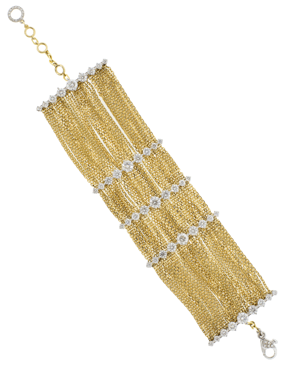 Mariani wide linked chain bracelet with diamonds set in 18k yellow gold.
