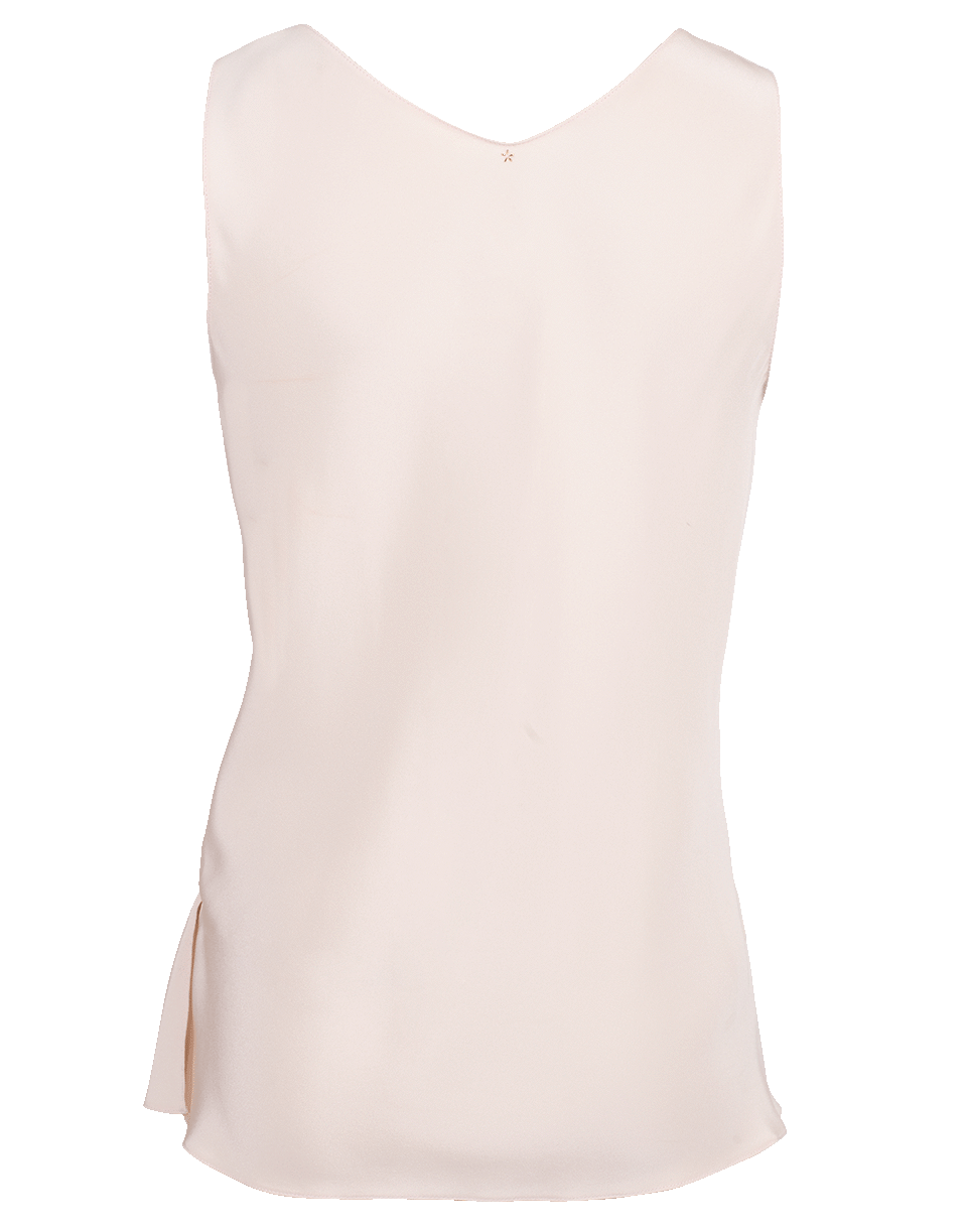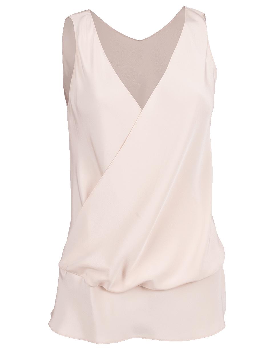 Wind top by Peter Cohen. Cut from silk, this delicate sleeveless top features a v-neckline, faux wrap draped front, pullover style and a regular fit.