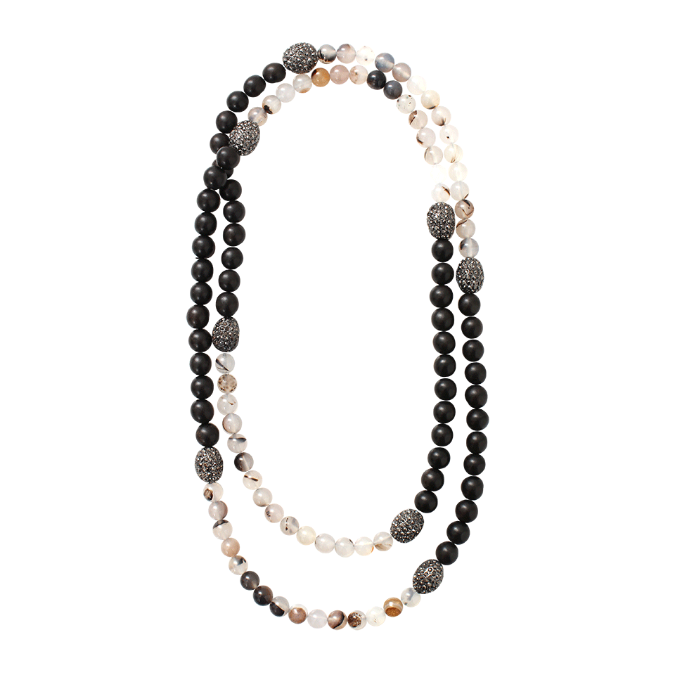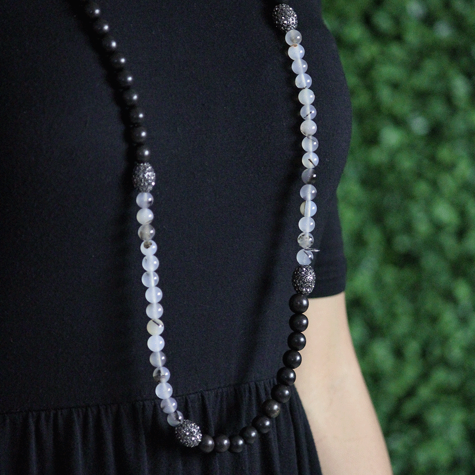 Black Wood Beading And Clear Quartz Beading With Black Pave Accent Beading