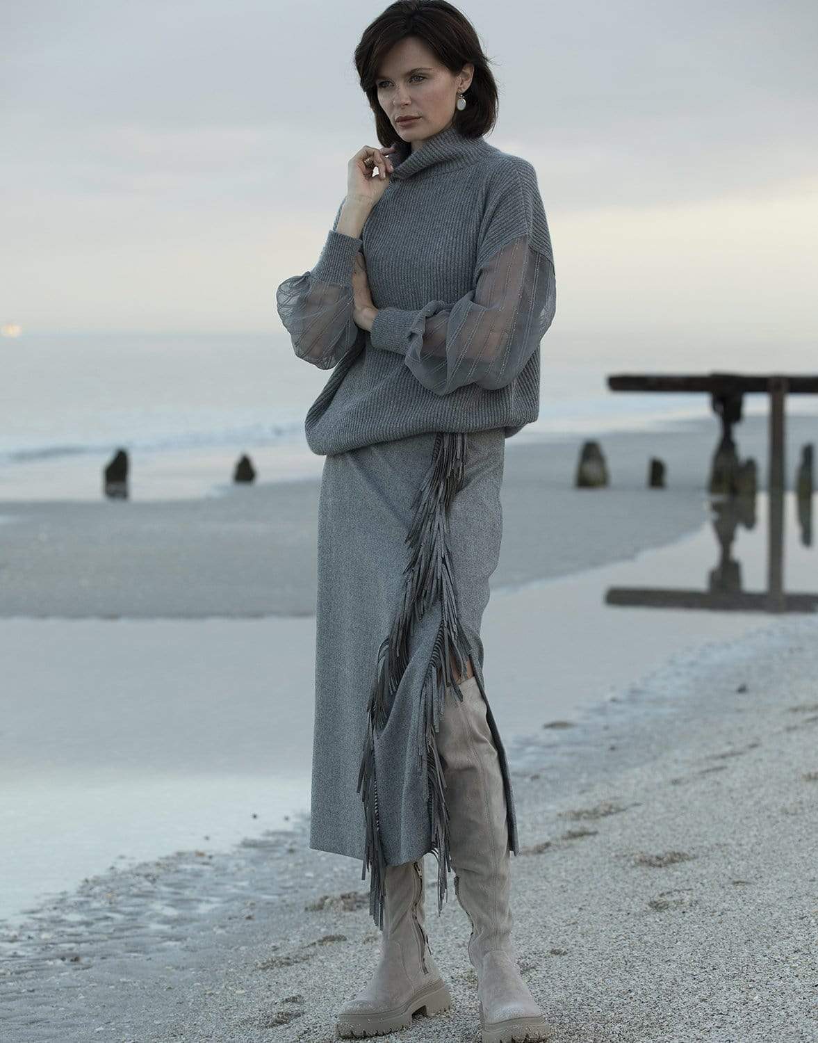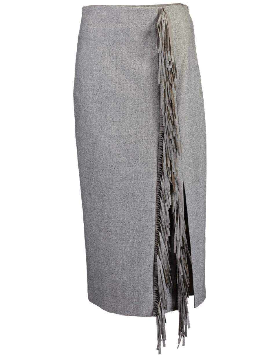 Brunello Cucinelli wool flannel fringe slit skirt in light grey.
