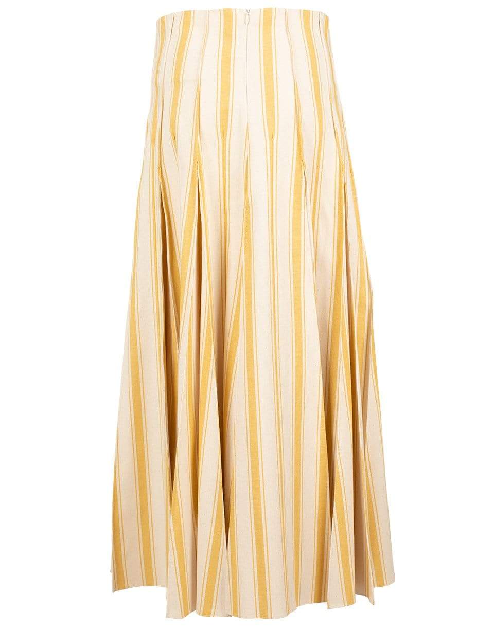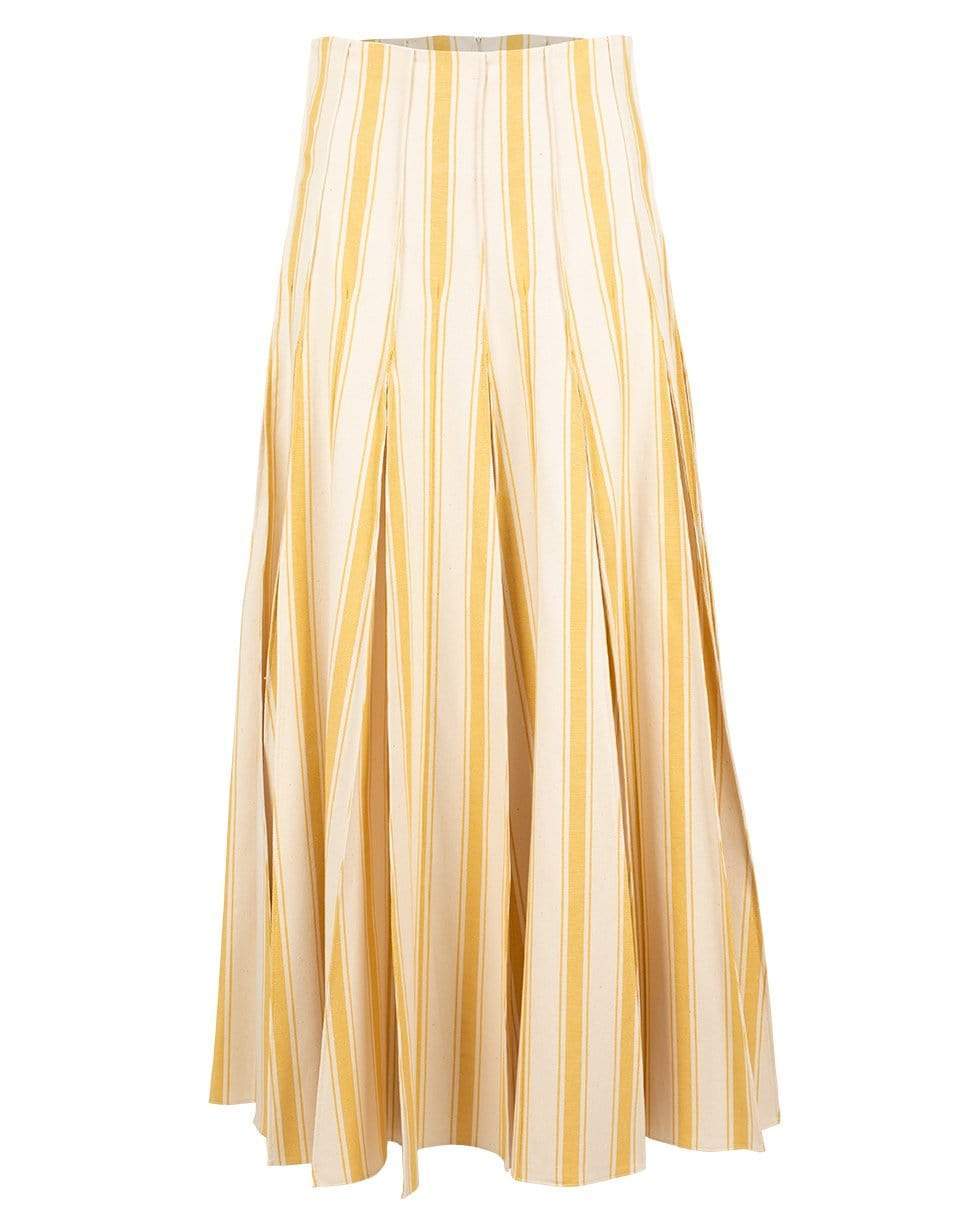 High waisted Rosie Assoulin million pleats skirt with concealed back zip closure, stitched pleats, all over striped pattern, and maxi length.