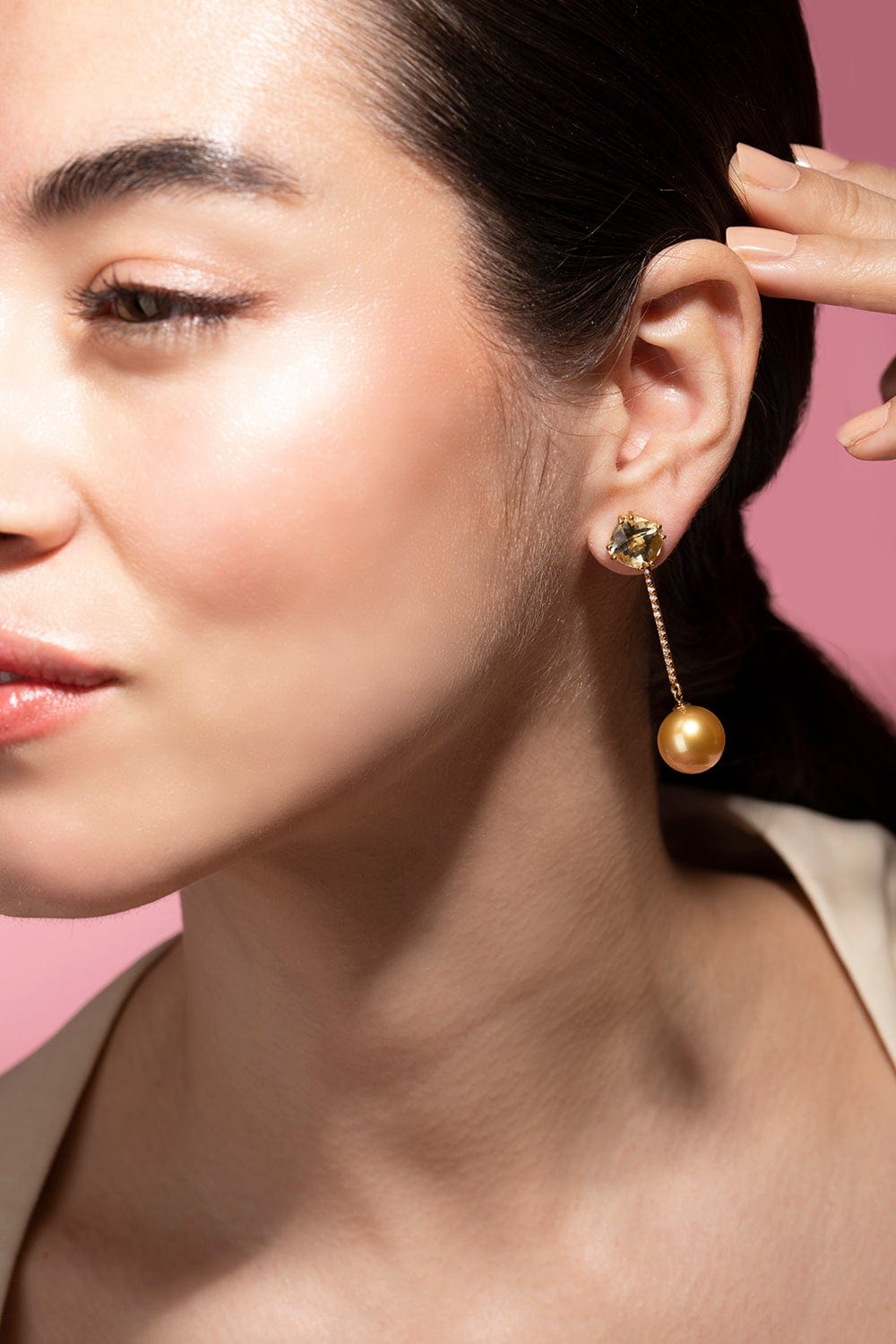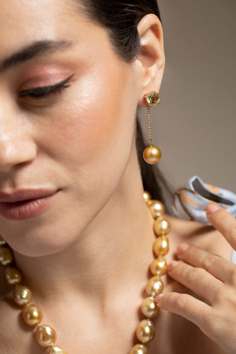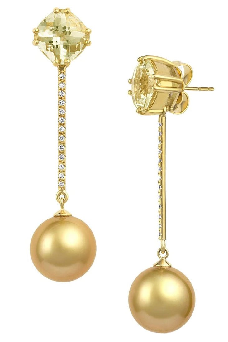 Baggins 18k yellow gold earrings with yellow beryl, diamond sticks and pearl drop.