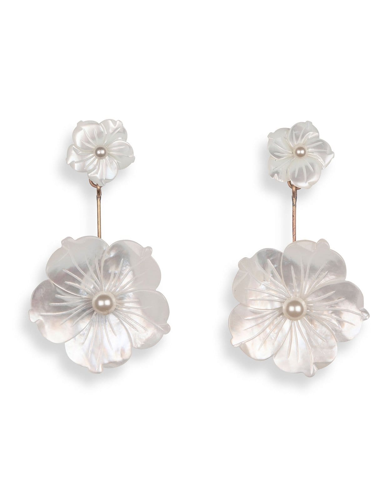 The Zinnia from Jennifer Behr is an elegant drop earring with two carefully hand-carved mother of pearl flowers finished with a smaller pearly center and a nickel free post closure. For pierced ears.