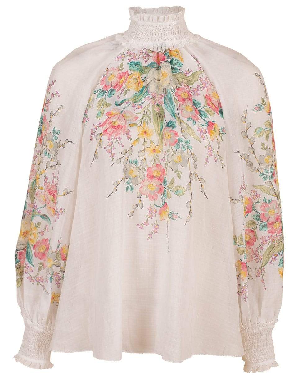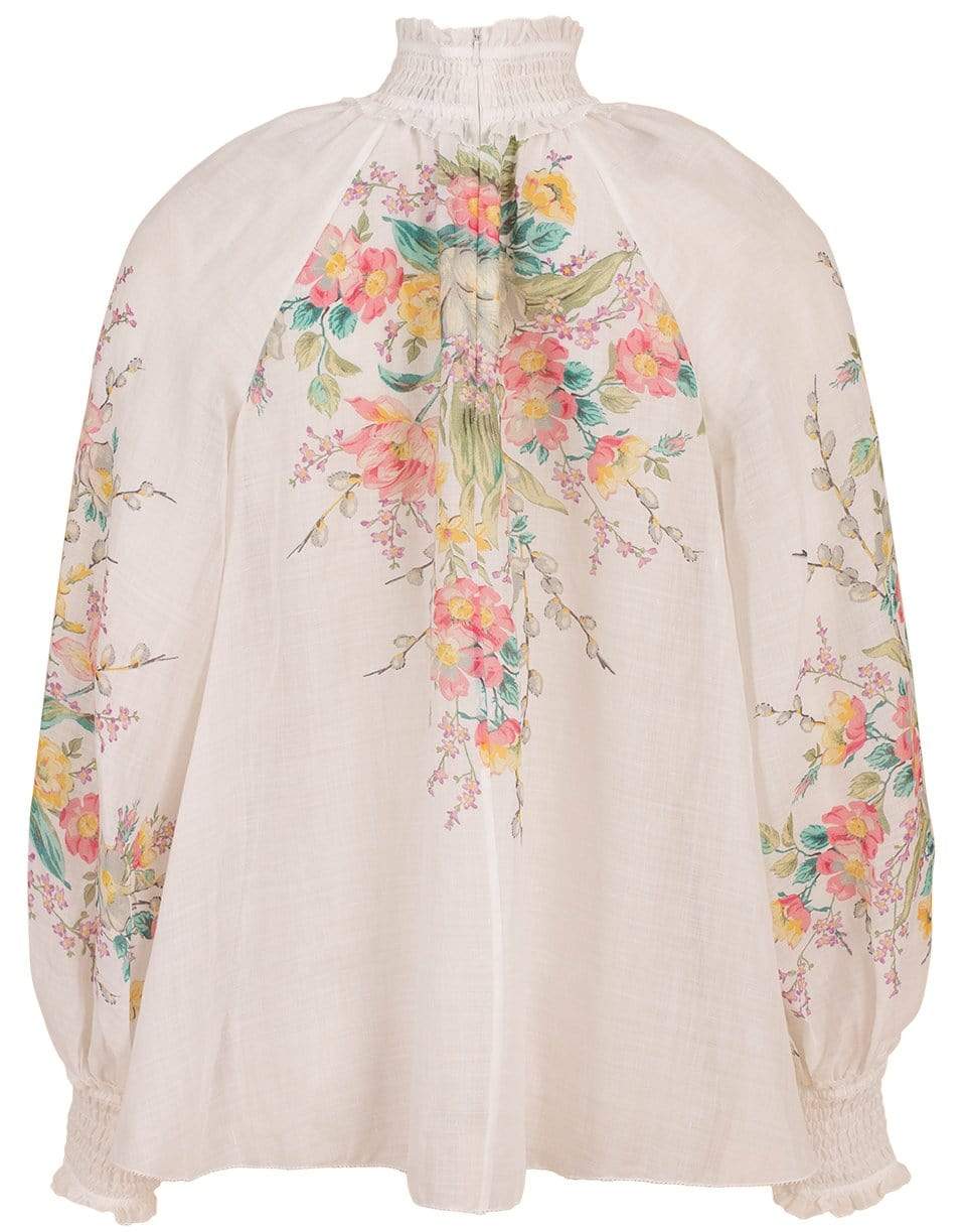 Ivory floral Zinnia shirred top from Zimmermann featuring a relaxed fit with a shirred high neck, long sleeves, and a concealed zip closure at back.